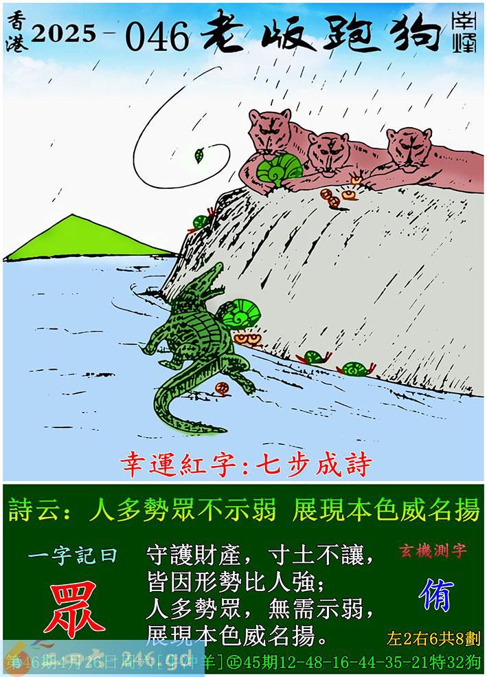 046期老版跑狗一字記之曰:【眾】 詩雲:人多勢眾不示弱,展現本色威名揚。