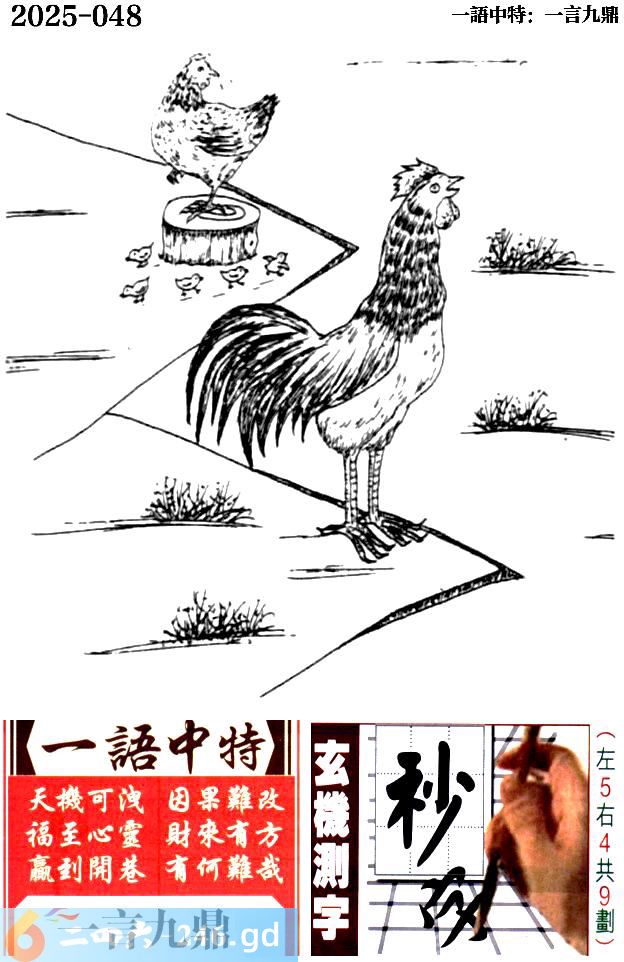 048期跑狗一字記之曰:【】 身披彩羽,雄姿英發。 長啼破曉,一聲驚鳴。 玄機測字:《秒》 一語中特:一言九鼎