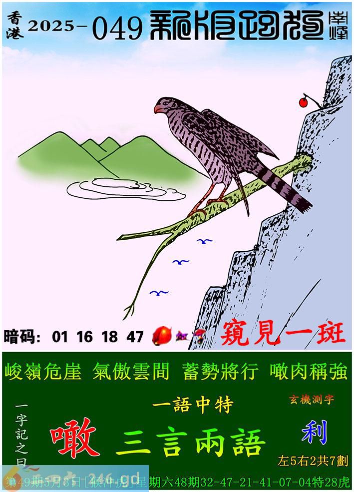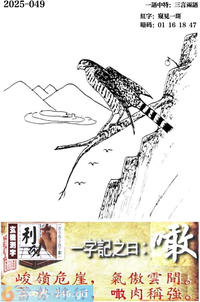 049期跑狗一字記之曰:【噉】 峻嶺危崖,氣傲雲間。 蓄勢將行,噉肉稱強。 玄機測字:《利》 一語中特:三言兩語