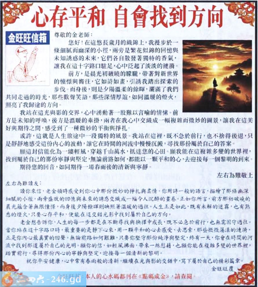 049期:金旺旺信箱彩民推荐→→《心存平和 自會找到方向》