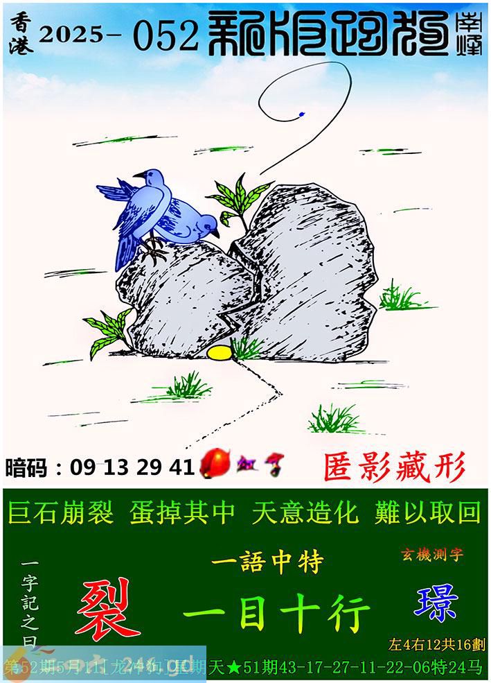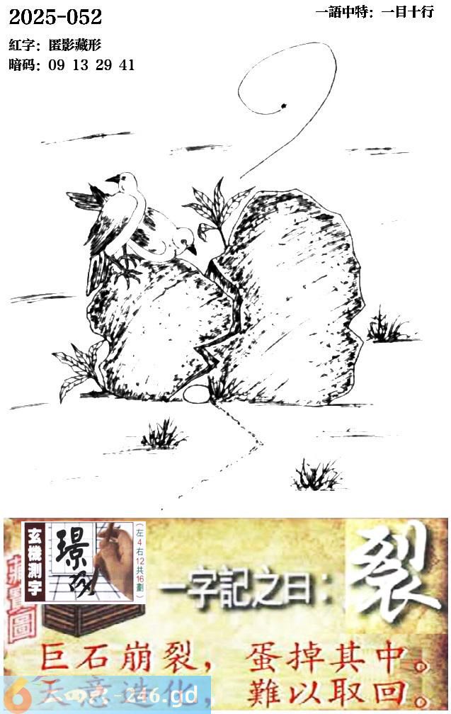 052期跑狗一字記之曰:【裂】 巨石崩裂,蛋掉其中。 天意造化,難以取回。 玄機測字:《璟》 一語中特:一目十行