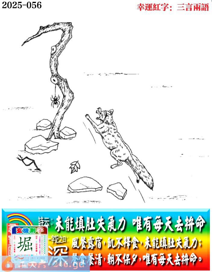056期老版跑狗一字記之曰:【深】 詩雲:未能填肚失氣力,唯有每天去拼命。 風餐露宿,飢不擇食,未能填肚失氣力; 餐食餐清,朝不保夕,唯有每天去拼命。 玄機測字:《堀》