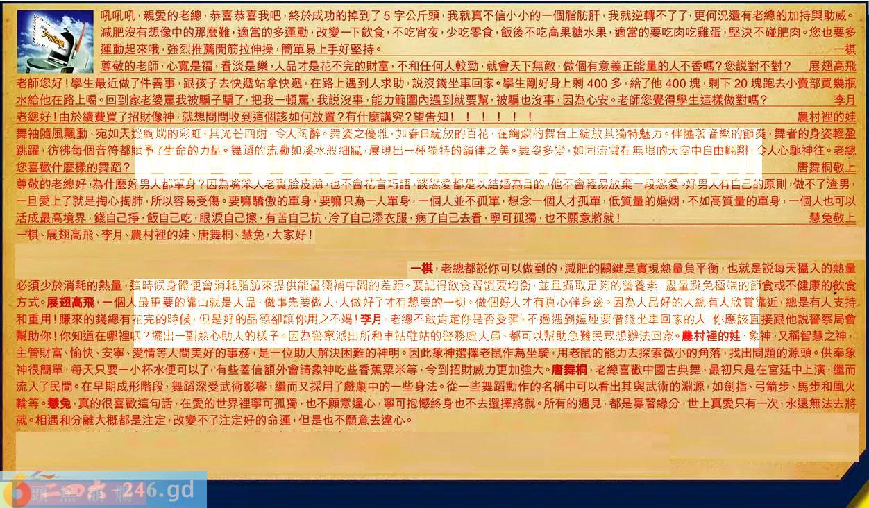 第056期《六合皇信箱文字版》10000%正確!!!正版二四六論壇*精心製作!!! 一棋、展翅高飛、李月、農村裡的娃、唐舞桐、慧兔,大家好! 【1】.吼吼吼,親愛的老總,恭喜恭喜我吧,終於成功的掉到了5字公斤頭,我就真不信小小的一個脂肪肝,我就逆轉不了了,更何況還有老總的加持與助威。減肥沒有想像中的那麼難,適當的多運動,改變一下飲食,不吃宵夜,少吃零食,飯後不吃高果糖水果,適當的要吃肉吃雞蛋,堅決不碰肥肉。您也要多運動起來哦,強烈推薦開筋拉伸操,簡單易上手好堅持。一棋 〖一棋〗:老總都說你可以做到的,减肥的關键是實現熱童負平衡,也就是說每天攝人的熱量必須少於消耗的熱量,這時候身體便會消耗脂肪來提供能量彌補中間的差距。要記得飲食習慣要均衡,並且攝取足夠的營養素,盡量避免極端的節食或不健康的飲食方式。 【2】.尊敬的老師,心寬是福,看淡是樂,人品才是花不完的財富,不和任何人較勁,就會天下無敵,做個有意義正能量的人不香嗎?您說對不對?展翅高飛 〖展翅高飛〗:一個人最重要的靠山就是人品,做事先要做人,人做好了才有想要的一切。做個好人才有真心伴身邊。因為人品好的人總有人欣賞靠近,總是有人支持和重用!賺來的錢總有花完的時候,但是好的品德卻讓你用之不竭! 【3】.老師您好!學生最近做了件善事,跟孩子去快遞站拿快遞,在路上遇到人求助,說沒錢坐車回家。學生剛好身上剩400多,給了他400塊,剩下20塊跑去小賣部買幾瓶水給他在路上喝。回到家老婆罵我被騙子騙了,把我一頓罵,我說沒事,能力範圍內遇到就要幫,被騙也沒事,因為心安。老師您覺得學生這樣做對嗎?李月 〖李月〗:老總不敢肯定你是否受騸,不過遇到這種要借錢坐車回家的人,你應該直接跟他說警察局會幫助你!你知道在哪裡嗎?擺出一副熱心助人的樣子。因為警察派出所和車站駐站的警務處人員,都可以幫助急難民眾想辦法回家。 【4】.老總好!由於續費買了招財像神,就想問問收到這個該如何放置?有什麼講究?望告知!!!!!!農村裡的娃 〖農村裡的娃〗:象神,又稱智慧之神,主管財富、愉快、安寧、愛情等人間美好的事務,是一位助人解決困難的神明。因此象神選擇老鼠作為坐騎,用老鼠的能力去探索微小的角落,找出問題的源頭。供奉象神很簡單,每天只要一小杯水便可以了,有些善信額外會請象神吃些香蕉粟米等,令到招財威力更加強大。 【5】.舞袖隨風飄動,宛如天邊絢爛的彩虹,其光芒四射,令大陶醉。舞姿之優雅,如春日綻放的百花,在絢爛的舞台上綻放其獨特魅力。伴隨著音樂的節奏,舞者的身姿輕盈跳躍,彷佛每個音符都賦予了生命的力量。舞蹈的流動如溪水般細腻,展現出種獨特的韻律之美。舞姿多變,如同流雲在無垠的天空中自由翱翔,令人心馳神往。老總您喜歡什麼樣的舞蹈?唐舞桐敬上 〖唐舞桐〗:老總喜歡中國古典舞,最初只是在宮廷中上演,繼而流入了民間。在早期成形階段,舞蹈深受武術影響,繼而又採用了戲劇中的一些身法。從一些舞蹈動作的名稱中可以看出其與武術的淵源,如劍指、弓箭步、馬步和風火輪等。 【6】.尊敬的老總好,為什麼好男人都單身?因為嘴笨人老實臉皮薄,也不會花言巧語,談戀愛都是以結婚為目的,他不會輕易放棄一段戀爱。好男人有自己的原則,做不了渣男,一旦愛上了就是掏心掏肺,所以容易受傷。要嘛驕傲的單身,要嘛只為一人單身,一個人並不孤單,想念一個人才孤單,低質量的婚姻,不如高質量的單身,一個人也可以活成最高境界,錢自己掙,飯自己吃,眼淚自己擦,有苦自己抗,冷了自己添衣服,病了自己去看,寧可孤獨,也不願意將就!慧兔敬上 〖慧兔〗:真的很喜歡這句話,在爱的世界裡寧可孤獨,也不願意達心,寧可抱憾終身也不去選擇將就。所有的遇見,都是靠著緣分世上真愛只有一次,永遠無法去將就。相遇和分離大概都是注定,改變不了注定好的命運,但是也不願意去違心。 紅字:頭焦額爛 暗码:01033538 [释义]形容十分狼狈窘迫。 [出处]明·许仲琳《封神演义》第九十七回:“摘星楼下势如焚,六宫三殿,沿烧得柱倒墙崩;天子命丧在须臾,八妃九嫔牵连得头焦额烂。