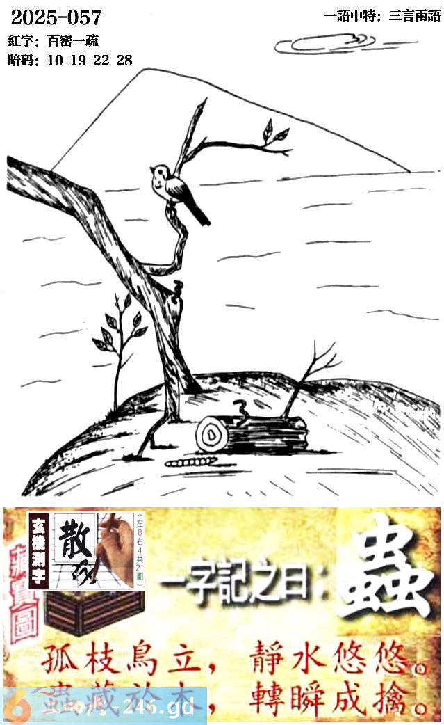057期跑狗一字記之曰:【蟲】 孤枝鳥立,靜水悠悠。 蟲藏於木,轉瞬成擒。 玄機測字:《散》 一語中特:三言兩語
