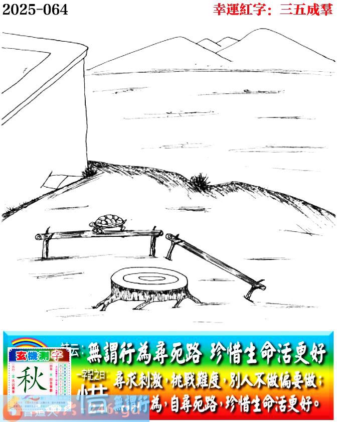 064期老版跑狗一字記之曰:【惜】 詩雲:無謂行為尋死路,珍惜生命活更好。 尋求刺激,挑戰難度,別人不走偏要做; 無謂行為,自尋死路,珍惜生命活更好。 玄機測字:《秋》