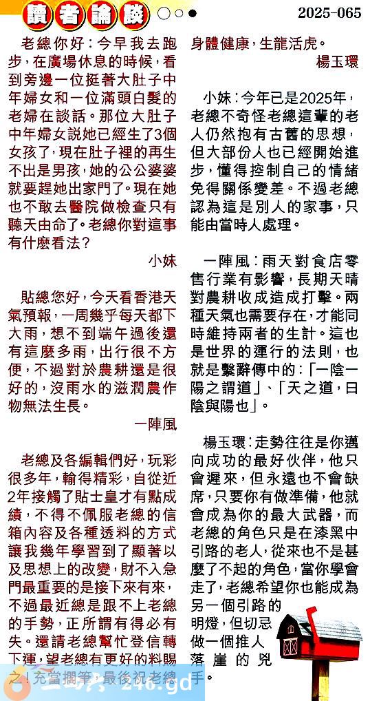 第零六五期讀者論談 1.老總你好:今早我去跑步,在廣場休息的時候,看到旁邊一位挺著大肚子中年婦女和一位滿頭白爱的老婦在談話。那位大肚子中年婦女說她已經生了3個女孩了,現在肚子裡的再生不出是男孩,她的公公婆婆就要趕她出家門了。現在她也不敢去醫院做檢查只有聽天由命了。老總你對這事有什麼看法?小妹 〖小妹〗:今年已是2025年,老總不奇怪老總這輩的老人仍然抱有古舊的思想,但大部份人也已經開始進步,懂得控制自己的情緒免得關係變差。不過老總認為這是別人的家事,只能由當時人處理。 2.貼總您好,今天看香港天氣預報,一周幾乎每天都下大雨,想不到端午過後還有這麼多雨,出行很不方便,不過對於農耕還是很好的,沒雨水的滋潤農作物無法生長。一陣風 〖一陣風〗:雨天對食店零售行業有影響,長期天晴對農耕收成造成打擊。兩種天氣也需要存在,才能同時維持兩者的生計。這也是世界的運行的法則,也就是擊辭傳中的:「一陰一陽之謂道」、「天之道,日陰與陽也」。 3.老總及各編輯們好,玩彩很多年,輸得精彩,自從近2年接觸了貼士皇才有點成績,不得不佩服老總的信箱內容及各種透料的方式讓我幾年學習到了顯著以及思想上的改變,財不入急門最重要的是接下來有來,不過最近總是跟不上老總的手勢,正所謂有得必有失。還請老總幫忙登信轉下運,望老總有更好的料賜之!充當擱筆,最後祝老總身體健康,生龍活虎。楊玉環 〖楊玉環〗:走勢往往是你邁向成功的最好伙伴,他只會遲來,但永遠也不會缺席,只要你有做準備,他就會成為你的最大武器,而老總的角色只是在漆黑中引路的老人,從來也不是甚麼了不起的角色,當你學會走了,老總希望你也能成為另一個引路的明燈,但切忌做一個推人落崖的兕手。
