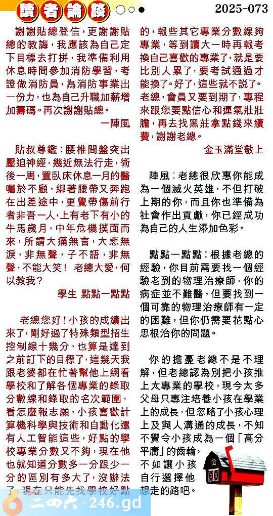 第零七三期讀者論談 1.謝謝貼總登信,更謝謝貼總的教誨,我應該為自己定下目標去打拼,我準備利用休息時間參加消防學習,考證做消防員,為消防事業出一份力,也為自己升職加薪增加籌碼。再次謝謝貼總。一陣風 〖陣風〗:老總很欣惠你能成為一個滅火英雄,不但打破上期的你,而且你也準備為社會作出貢獻,你已經成功為自己的人生添加色彩。 2.貼叔尊鑑:腰椎間盤突出壓迫神經,幾近無法行走,術後一周,置臥床休息一月的醫囑於不顧,綁著腰帶又奔跑在出差途中,更覺帶傷前行者非吾一人,上有老下有小的牛馬歲月,中年危機撲面而來,所謂大痛無言,大悲無淚,非無聲,子不語,非無聲,不能大笑!老總大愛,何以教我?學生點點一點點 〖點點一點點〗:根據老總的經驗,你目前需要找一個經驗老到的物理治療師,你的病症並不難醫,但要找到一個可靠的物理治療師有一定的困難,但你仍需要花點心思根治你的問題。 3.老總您好!小孩的成績出來了,剛好過了特殊類型招生控制線十幾分,也算是達到之前訂下的目標了,這幾天我跟老婆都在忙著幫他上網看學校和了解各個專業的錄取分數線和錄取的名次範圍,看怎麼報志願,小孩喜歡計算機科學與技術和自動化還有人工智能這些,好點的學校專業分數又不夠,現在他也就知道分數多一分跟少一分的區別有多大了,沒辦法了,現在只能先找學校好點的,報些其它專業分數線夠專業,等到讀大一時再報考換自己喜歡的專業了,就是要比別人累了,要考試通過才能換了。好了,這些就不說了。老總,會員又要到期了,專程來跟您要點信心和運氣壯壯膽,再去找黑莊拿點錢來續费,謝謝老總。金玉滿堂敬上 〖金玉滿堂〗:你的擔憂老總不是不理解,但老總認為別把小孩推上太專業的學校,現今太多父母只專注培養小孩在學業上的成長,但忽略了小孩心理上及與人溝通的成長,不知不覺令小孩成為一個「高分平庸」的齒輪,不如讓小孩自行選擇他想走的路吧。