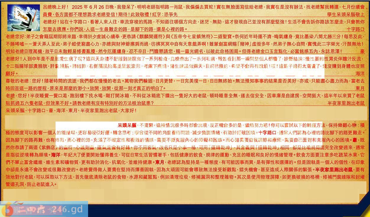 第078期《六合皇信箱文字版》10000%正確!!!正版二四六論壇*精心製作!!! 呆頭呆腦、十字路口、豪、海洋、東月、半夜家里跑出老鼠,大家好! 【1】.呂總晚上好!2025年6月26日晚,我發呆了,明明老師指明路一肖鼠我,偏偏去買蛇!實在無臉面寫信給老總,我實在是沒有辦法,找老總幫我轉運,七月份續會員费,各方面都不理想跪求老總登信!期待!此致敬禮!紅字:恐爭先學生呆頭呆腦敬上 〖呆頭呆腦〗:不要緊,這種情況很多時都會出現,反正機會多的是,繼續努力吧!你可以嘗試以下的轉運方法,保持樂觀心態,積極的態度可以影響一個人的能量場,更容易吸引好運。轉念思考:學會從不同的角度看待問題,减少負面情緒,有助於打破困境。 【2】.老總好!站在十字路口,看著人來人往,車流穿梭的馬路,不知道往哪個方向走,迷茫、無助,這才發現自己並沒有那麼堅強!生活不會告訴你路該怎麼走,只會教你怎麼去適應。你們說,人這一生最難走的路,是腳下的路,還是心裡的路。十字路口 〖十字路口〗:通常人們認為心裡的路比腳下的路更難走。因為腳下的路再難,也有終點,而心裡的路,充滿了不確定性和複雜的情感,需要不断克服內心的障礙和困惑。而心路需要自我調節和療瘛,需要自己面對和克服內心的困境。 【3】.老總您好:弟子之會籍屆期即將來臨,幸得於夕虔誠心續奉,更恭請《麒麟開運符》與《五帝今七星鎮煞符》二道聖寶。奈何近年時運不濟,晦氣纏身,竟比墨染八筒尤勝三分!每思及此,不勝唏嘘--蒼天弄人至此,弟子縱使窮盡心力,亦總與財神爺擦肩而過,彷佛冥冥中自有天意戲弄啊!雖蒙創富網賜「賭神」虛銜多年,然弟子撫心自問實愧此二字榮光,汗顏無地!明知老總日理萬機,故平日未敢輕易修書亂擾,然今厄運缠身,忍不卒目,鬥膽懇請您,賜一靈光網名,以破此命格困局。但得老總金口玉言點化,必當銘感五內,永誌恩澤!豪 〖豪〗:既然你恭請了兩道《紫飾店》的靈符,心誠則靈,運氣定會有好轉。你不用客氣,改名只是小事一椿,可用「運轉乾坤」,其含義與「扭轉乾坤」相同,都是比喻將局面完全改變過來,通常是指從逆境轉為順境。 【4】.老總好!人到中年是不是就愛生病了呢?這兩天身體不舒服到醫院做了一系列檢查,竟檢查出了一系列毛病,報告看到那一瞬間整個人都懵了,診斷結論:慢性菱縮性胃炎伴瞻汁反流,十二指腸球部潰膀胱,肝囊腫脹,肺結節,右側膈肌抬高並星波浪形,考慮下病情醫生建議做兩天,目前已預約,希望不會再有麻煩!哎!這輩子過得太窩囊了,錢沒賺到身體也沒照顧好。海洋 〖海洋〗:年紀大了便要開始懂得養生,可從日常生活習慣著手,包括健康的飲食、規律的運動、充足的睡眠和良好的情緒管理。飲食方面要注意多吃蔬菜水果,它們不單止富含纖維、維生素和礦物質,更有助於消化、抗氧化,並維持健康。 【5】.尊敬的老總:您好!隨著時間的流逝,我們都在慢慢的老去。萬物我們輪迴,日月更替,一日完美復一日,日日無終始。無法預知事事的結果是否美好,亦或,只能盡心盡力而為,當老去時回首這一路的歷程,原來是那麼的渺小。放開,放開,從那一刻才真正的明白了。東月 〖東月〗:老總認為堅持是一種態度,有可能因事而異,是有彈性和選擇的。但是固執是一個人的個性,在印象中卻是永遠不會改變或很難改變的。老總覺得做人要貴在堅持而擇善固執,因為太頑固可能會導致無法接受新觀點、錯失機會,甚至造成人際關係的緊張。 【6】.老總,您好!半夜睡覺一覺口渴,跑到樓下找水喝,剛打開冰箱,不料從冰箱底下鑽出一隻好大的老鼠,頓時睡意全無,遂去信安全,因車庫是自建房,空間挺大,這半年以來買了老鼠貼抓過五六隻老鼠,但效果不好。請教老總有沒有特別好的方法根治鼠患?半夜家里跑出老鼠 〖半夜家里跑出老鼠〗:要有效地對付老鼠,可以採取以下方法,首先徹底清除老鼠的食物、水源和藏匿點,例如清理垃圾、修補漏洞和整理雜物。其次是使用物理屏障,如更換破損的格柵、修補門窗縫隙和封堵管道孔洞,防止老鼠進入。 紅字:艱苦鑽究 暗码:02103149 [释义]指生活或工作条件差且处境困难的状态下,探求事物的真相。