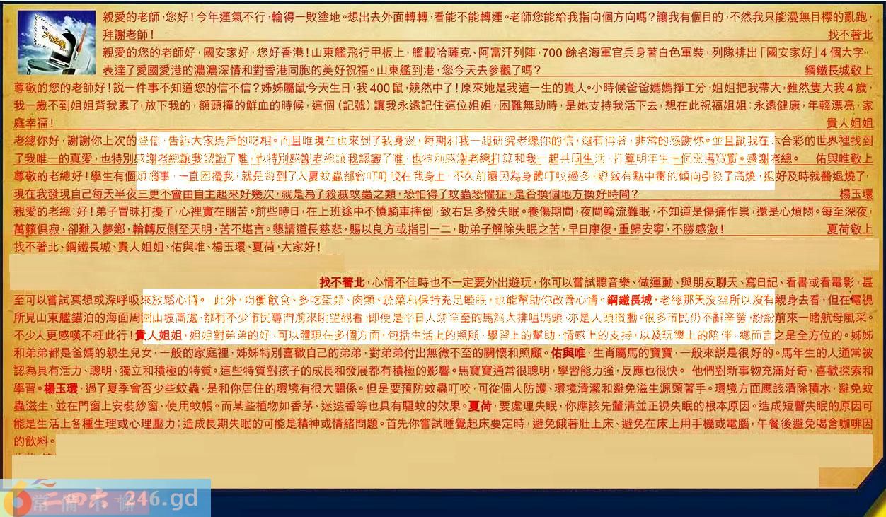 第081期《六合皇信箱文字版》10000%正確!!!正版二四六論壇*精心製作!!! 找不著北、鋼鐵長城、貴人姐姐、佑與唯、楊玉環、夏荷,大家好! 【1】.親愛的老師,您好!今年運氣不行輸得一敗塗地。想出去外面轉轉,看能不能轉運。老師您能給我指向個方向嗎?讓我有個目的,不然我只能漫無目標的亂跑,拜謝老師!找不著北 〖找不著北〗:心情不佳時也不一定要外出遊玩,你可以嘗試聽音樂、做運動、與朋友聊天、寫日記、看書或看電影,甚至可以嘗試冥想或深呼吸來放鬆心情。此外,均衡飲食多吃蛋類、肉類、蔬菜和保持充足睡眠,也能察助你政善心情。 【2】.親愛的您的老師好,國安家好,您好香港!山東艦飛行甲板上,艦載哈薩克、阿富汗列陣,700餘名海軍官兵身著白色軍装,列隊排出「國安家好」4個大字表達了愛國愛港的濃濃深情和對香港同胞的美好祝福。山東艦到港您今天去參觀了嗎?鋼鐵長城敬上 〖鋼鐵長城〗:老總那天沒空所以没有親身去看,但在電視所見山東艦錨泊的海面周圍山坡高處,都有不少市民專門前來眺望觀看,即便是平日人跡罕至的馬灣大排咀碼頭,亦是人頭攢動,很多市民仍不辭辛勞纷紛前來一睹航母風采。不少人更感嘆不枉此行! 【3】.尊敬的您的老師好!說一件事不知道您的信不信?姊姊屬鼠今天生日,我400鼠競然中了!原來她是我這一生的貴人。小時候爸爸媽媽掙工分,姐姐把我帶大,雖然隻大我4歲,我一歲不到姐姐背我累了,放下我的,額頭撞的鮮血的時候,這個(記號)讓我永遠記住這位姐姐,困難無助時,是她支持我活下去,想在此祝福姐姐:永遠健康,年輕漂亮,家庭幸福!貴人姐姐 〖貴人姐姐〗:姐姐對弟弟的好,可以體現在多個方面包括生活上的照顧、學習上的幫助、情感上的支持、以及玩樂上的陪伴,總而言之是全方位的。姊姊和弟弟都是爸媽的親生兒女,一般的家庭裡,姊姊特別喜歡自己的弟弟,對弟弟付出無微不至的關懷和照顧。 【4】.老總你好,謝謝你上次的登信,告訴大家馬户的吃相。而且唯現在也來到了我身邊,每期和我一超研究老想你的信,還有得著,非常的感謝你。並且讓我在六合彩的世界裡找到了我唯一的真爱,也特別感謝老總讓我認識了唯!也特别感謝老總讓我認識了唯,也特別感謝老總打算和我一起共同生活,打算明年生一個黑馬寶寶。感謝老總。佑與唯敬上 〖佑與唯〗:生肖屬馬的寶寶,一般來說是很好的。馬年生的人通常被認為具有活力、聰明、獨立和積極的特質。這些特質對孩子的成長和發展都有積極的影響。馬寶寶通常很聰明,學習能力強,反應也很快。他們對新事物充滿好奇,喜歡探索和學習。 【5】.尊敬的老總好!學生有個煩惱事,一直困擾我,就是每到了入夏蚊蟲都會叮可咬在我身上,不久前還因為身體叮咬過多,導致有點中毒的傾向引發了高燒,還好及時就醫退燒了,現在我發現自己每天半夜三更不會由自主起來好幾次,就是為了殺滅蚊蟲之類,恐怕得了蚊蟲恐懼症,是否换個地方換好時間?楊玉環 〖楊玉環〗:過了夏季會否少些蚊蟲,是和你居住的環境有很大關係。但是要預防蚊蟲叮咬,可從個人防護、環境清潔和避免滋生源頭著手。環境方面應該清除積水避免蚊蟲滋生,並在門窗上安装紗窗、使用蚊帳。而某些植物如香茅、迷迭香等也具有驅蚊的效果。 【6】.親愛的老總:好!弟子冒昧打擾了心裡實在睏苦。前些時日,在上班途中不慎騎車摔倒,致右足多發失眠。養傷期間,夜間輪流難眠,不知道是傷痛作崇,還是心煩悶。每至深夜,萬籟俱寂,卻難入萝鄉,輪轉反側至天明,苦不堪言。懇請道長兹悲,賜以良方或指引一二,助弟子解除失眠之苦,早日康復,重歸安寧,不勝感激!夏荷敬上 〖夏荷〗:要處理失眠,你應該先釐清並正視失眠的根本原因。造成短暫失眠的原因可能是生活上各種生理或心理壓力;造成長期失眠的可能是精神或情緒問題。首先你嘗試睡覺起床要定時,避免餓著肚上床、避免在床上用手機或電腦,午餐後避免喝含咖啡因的飲料。 紅字:常備不懈 暗码:02151826 [释义]时刻准备着,毫不忪懈。