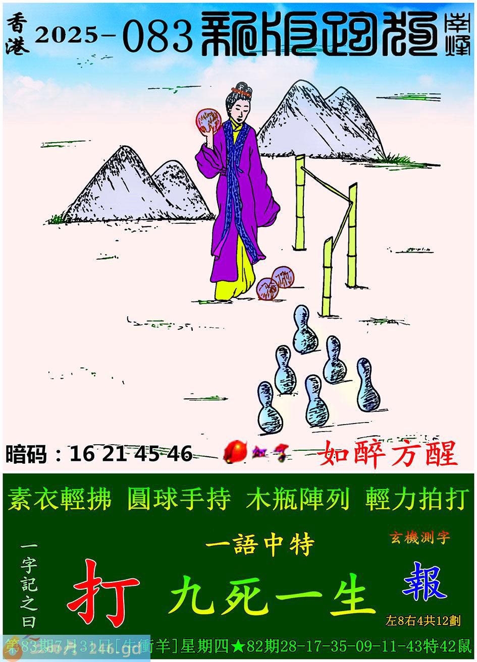 083期跑狗一字記之曰:【打】 素衣輕拂,圓球手持。 木瓶陣列,輕力拍打。 玄機測字:《報》 一語中特:九死一生