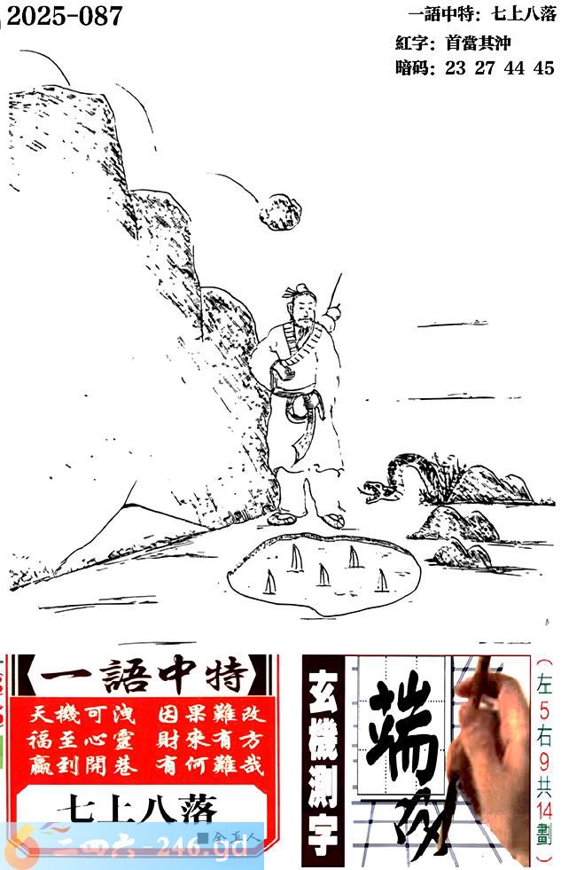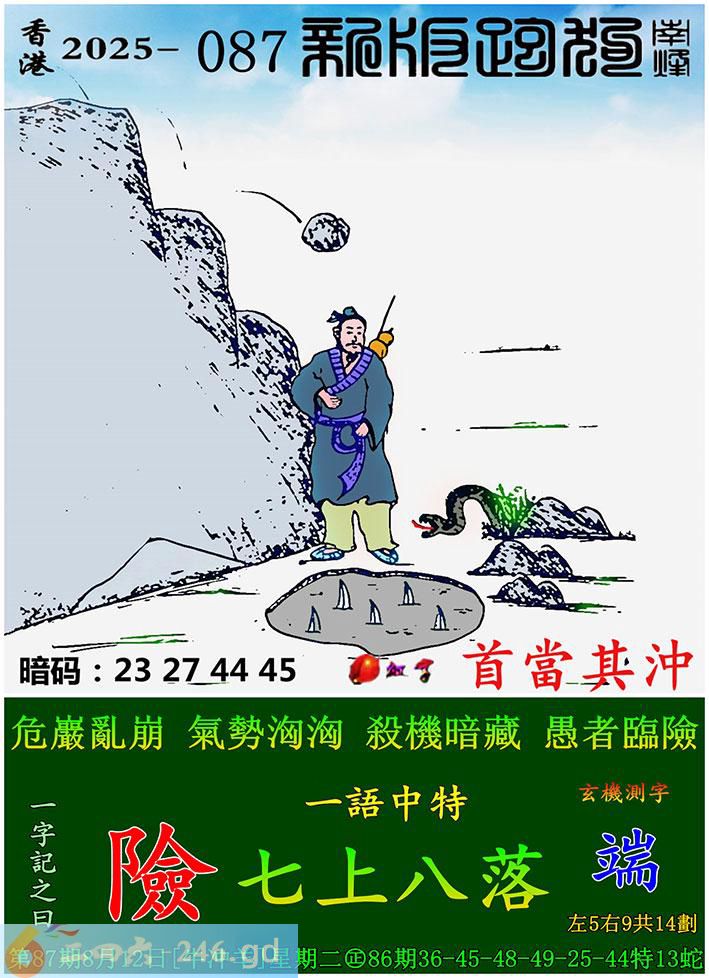 087期跑狗一字記之曰:【險】 危巖亂崩,氣勢洶洶。 殺機暗藏,愚者臨險。 玄機測字:《端》 一語中特:七上八落