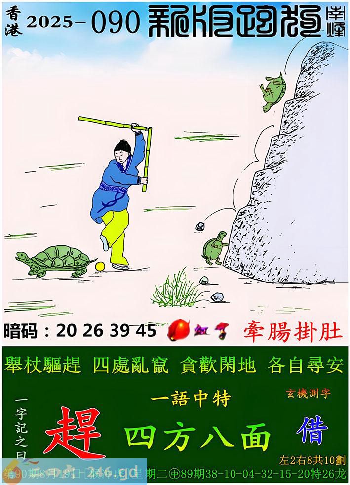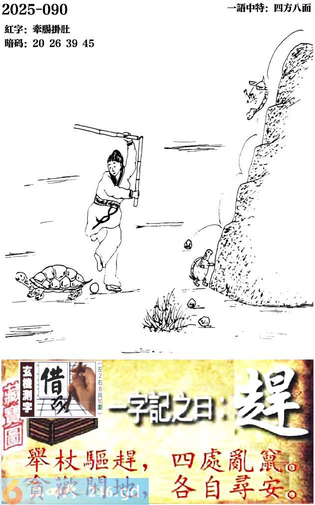 090期跑狗一字記之曰:【趕】 舉杖驅趕,四處亂竄。 貪歡閑地,各自尋安。 玄機測字:《借》 一語中特:四方八面