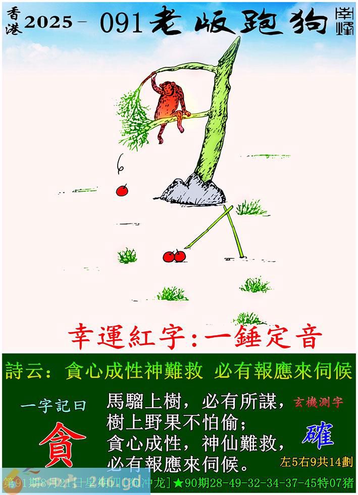 091期老版跑狗一字記之曰:【貪】 詩雲:貪心成性神難救,必有報應來伺候。 馬騮上樹,必有所謀,樹上野果不怕偷; 貪心成性,神仙難救,必有報應來伺候。 玄機測字:《確》
