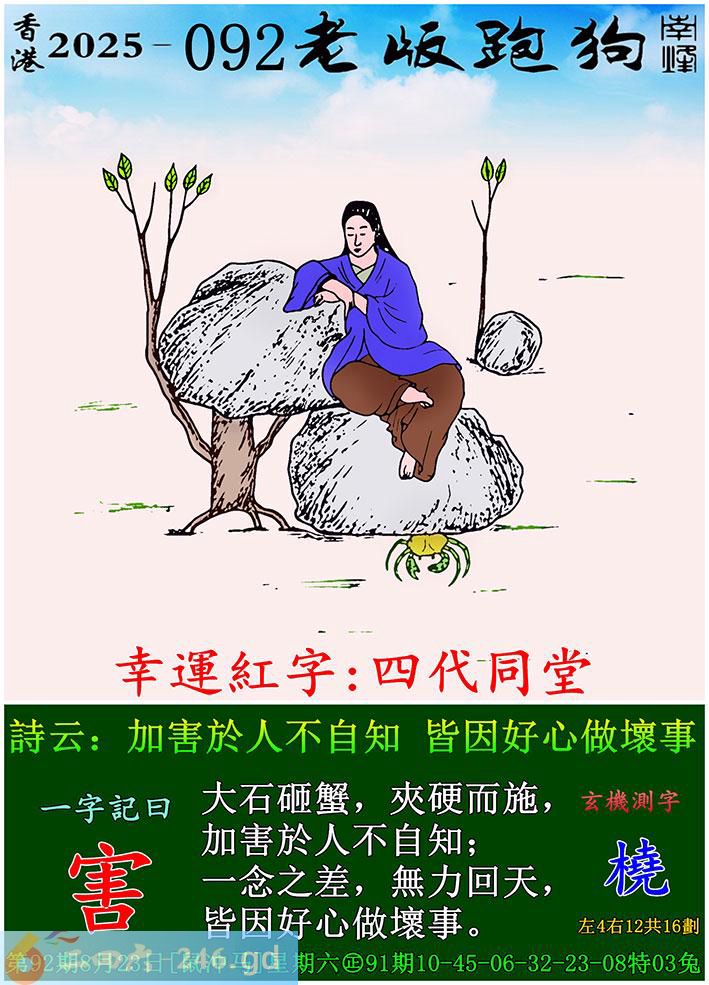 092期老版跑狗一字記之曰:【害】 詩雲:加害於人不自知,皆因好心做壞事。 大石砸蟹,夾硬而施,加害於人不自知; 一念之差,無力回天,皆因好心做壞事。 玄機測字:《橈》