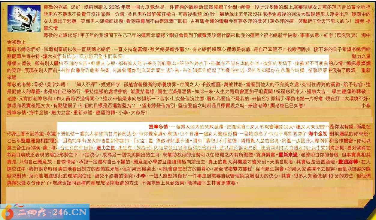 第027期《六合皇信箱文字版》10000%正確!!!正版二四六論壇*精心製作!!! 提筆忘情、海中金初、魅力之星、重新來過、豐迴路轉、小李,大家好! 【1】.尊敬的老總:您好!沒料到踏入2025年第一個大瓜竟然是一件普通的離婚訴訟案震驚了全網,網傳一段七分多鍾的線上庭審現場女方燕冬萍巧舌如簧全程控訴男方不養家不負責任沒往家掙一分錢,並且男方辯解瘋狂搶白,可最後視頻20秒一顧地說出五年來沒往家掙金最後的判決大跌眼鏡男人淨身出戶!鏡頭中的女人露出了邪魅一笑而男人卻掩面抹淚,看到這裏我不由得濕潤了眼眶,古有潘金蓮的毒藥今有燕冬萍的微笑!燕冬萍的這一笑擊碎了全天下男人的心!讀者提筆忘情 〖提筆忘情〗:一個男人最大的失敗就是,把逗笑自己女人的機會讓給別人。讓女人失望的不是你沒有錢,而是在你身上看不到希望。永遠不要低估一個女人和你同甘共苦的決心,但你要拿真心來換。也不要讓一個女人適應孤獨,一旦她適應了,也就不再需要你了。 【2】.尊敬的老總您好!甲子年的我想問下在乙巳年的運程怎麼樣?剛好會員到了續費我該選什麼來助我的運程?祝老總新年快樂,事事如意...紅字(豕突狼奔)海中金初敬上 〖海中金初〗:對於屬鼠的你來說,乙巳年整體運勢相對穩定,因為蛇年有強大的吉星對你加持,「玉堂」星,象徽著財運亨通。還有「索微」和「龍德」兩顆貴人星的出現,將進一步提升人際關係和合作機會。你可以選三合生肖的猴、龍,和六合生肖的牛掛飾。 【3】.尊敬老總你們好,知道創富網以後一直跟随老總們,一直支持創富網,雖然總是輸多赢少,有老總們領頭心裡總是有底,是自己笨跟不上老總們腳步,接下來的日子希望老總們給點簡單生肖中特,讓六友們有信心,祝老總們全家們幸福。魅力之星 〖魅力之星〗:老總在《創富網》內經常發紅包和福利給會員們,就以蕭公論壇為例,連續兩期中冷肖雞和狗。其中開狗肖那期:看好狗肖在秋肖目前缺乏表現的暗淡形勢之下,下定決心,成為另一個快將開出的生肖,來幫助秋肖的走勢可以在短期之內有所復甦,貨真價實。 【4】.每個人背後,都有別人體會不到的辛苦。每個人心裡,都有旁人無法感受到的難處。堅強的外表下,隱藏著不能言說的心聲。微笑的表情下,掩飾著不可表露的心情。總把最燦爛的笑容,展現在別人面前。有誰會懂你到底有多痛,有誰會懂你到底要怎麼生活下去。有誰知道你經歷了怎樣的生活,又有誰知道你在悲傷的時候,卻發現原來沒有了眼淚!重新來過 〖重新來過〗:老總明白你的苦處,但事實真相其實是:只有自己願意放下自憐情緒,承認一定還有自己不懂的,願意虛心學習且繼續積極向前走去,真正的貴人與機運才會來到。天助自助者,其實就是這個道理。 【5】.尊敬的老總:您好!見字如晤!“知人不評”,短短四字,卻蘊含著極高的修養境界。世間之人,千般經歷,萬般性格,當看到他人的不完美之處,克制住評判的衝動,給予包容,這是對他人的尊重,也是給自己的修行。秉持這樣的處世態度,能廣結善緣,讓生活滿是溫情。如此一來,人生之路將會更加平坦寬闊!祝福您及家人,遇事大吉!學生豐迴路轉敬上 〖豐迴路轉〗:在人際交往中,我們很多時候清楚地看出對方的虚偽或矛盾,但如果直接道出,可能會傷害對方的自尊心,甚至破壞雙方關係,從而產生誤會。如果大家選擇不去揭穿,而是以包容的態度來對待,反而能增進彼此的理解與信任,避免不必要的衝突。 【6】.老總,元宵節老總您和工作人员是否過得開心?這次來信是來向您傾訴一下苦水,上次登信沒注意,還以為登信不是我的,去信名字弄錯了,辜負老總一片好意。現在打工大環境不好,夢想和現實差距太大,有點迷惘了。年初的目標是否還能堅持??望老總登信指引,堅信登信之時就是目標實現之時。感謝老總!願老總巳巳如意!小李 〖小李〗:一個人能堅持做好一件事是很需要自我管理與克服阻力的決心,其實,很多人知道做到10分的方法,但他們選擇只做8分便好了。老總也認同這種向著理想循序漸進的方法,不強求馬上見到效果,能持續下去其實更重要。 紅字:冤家對頭 暗码:10223940 [释义]指仇人,仇敌。 [出处]清·李渔《慎鸾交·狠图》:“谁想才学之才与钱财之财两下里是冤家对头,从来不肯见面的。”