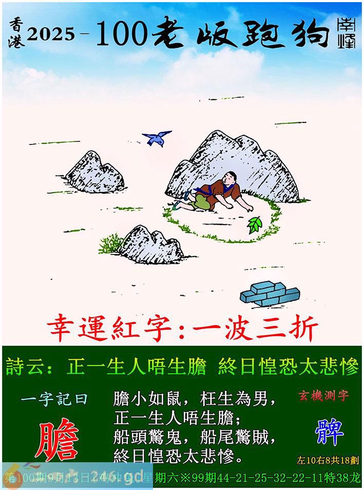 100期老版跑狗一字記之曰:【膽】 詩雲:正一生人唔生膽,終日惶恐太悲慘。 膽小如鼠,枉生為男,正一生人唔生膽; 船頭驚鬼,船尾驚賊,終日惶恐太悲慘。 玄機測字:《髀》
