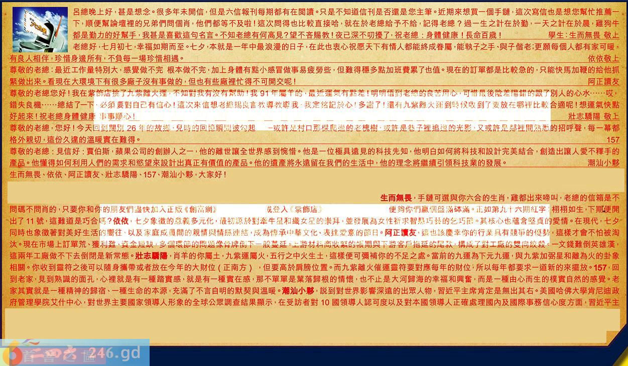 第103期《六合皇信箱文字版》10000%正確!!!正版二四六論壇*精心製作!!! 生而無畏、依依、阿正讀友、壯志驕陽、157、潮汕小夥,大家好! 【1】.呂總晚上好,甚是想念。很多年未開信,但是六信報刊每期都有在閱讀。只是不知道信刊是否還是您主筆。近期來想買一個手鏈,這次寫信也是想您幫忙推薦一下,順便幫論壇裡的兄弟們問個肖,他們都等不及啦!這次問得也比較直接哈,就在於老總給予不給,記得老總?過一生之計在於勤,一天之計在於晨,雞狗牛都是勤力的好幫手,我甚是喜歡這句名言。不知老總有何高見?望不吝賜教!夜已深不叨擾了,祝老總:身體健康!長命百歲!學生:生而無畏敬上 〖生而無畏〗:手鏈可選與你六合的生肖,雞都出來啼叫,老總的信箱是不問碼不問肖的,只要你和你的朋友們盡快加入正版《创富網》或登入《紫飾店》便夠你們贏個盤滿体滿。正如第九十六期紅字:栩栩如生,下期便開出了11號,這難道是巧合嗎? 【2】.老總好,七月初七,幸福如期而至。七夕本就是一年中最浪漫的日子,在此也衷心祝愿天下有情人都能終成眷屬,能執子之手、與子偕老更願每個人都有家可暖、有良人相伴,珍惜身邊所有,不負每一場珍惜相遇。依依敬上 〖依依〗:七夕象徽的意義多元化,最初源於對牽牛星和織女星的崇拜,並發展為女性祈求智慧巧藝的乞巧節。其核心也蘊含堅貞的愛情。在現代,七夕同時也象徵著對美好生活的響往,以及家庭成員間的親情與情感連結,成為傳承中華文化表達爱意的節日。 【3】.尊敬的老總:最近工作量特別大,感覺做不完根本做不完,加上身體有點小感冒做事易疲勞些,但難得穩多點加班费累了也值。現在的訂單都是比較急的,只能快馬加鞭的給他抓緊做出來。看現在大環境下有很多廠子沒有事做的,但也有些廠裡忙得不可開交呢!阿正讀友 〖阿正讀友,這也該慶幸你的行業具有競爭的優勢,這樣才會不怕被淘汰。現在市場上訂單荒、獲利難、資金短缺,多個環節的問題像骨牌倒下一般蔓延。上游材料商收緊的帳期與下游客户拖延的尾款,構成了對工廠的雙向絞殺。一文錢難倒英雄漢,這兩年工廠做不下去倒閉是新常態。 【4】.尊敬的老總您好!我在紫飾店挑了九紫離火運,不知對我有沒有幫助!我91年屬羊的,最近運氣有點差!明明悟到老總的良苦用心,可惜最後险差陽錯的跟了别人的心......哎,錯失良......總結了一下,必須要對自己有信心!這次來信想老總賜良言教導教導我,我定銘記於心!多謝了!還有九紫離火運到時候收到了要放在哪裡比較合適呢!想運氣快點好起來!祝老總身體健康事事順心!壯志驕陽敬上 〖壯志驕陽〗:肖羊的你屬土,九紫運屬火,五行之中火生土,這樣便可彌補你的不足之處。當前的九運為下元九運,與九紫加弼星和離為火的卦象相關。你收到靈符之後可以随身攜帶或者放在今年的大財位(正南方),但要高於盾膀位置。而九紫離火催運靈符要對應每年的財位;所以每年都要求一道新的來擺放。 【5】.尊敬的老總,您好!今天回到闊別26年的故鄉,兒時的回憶瞬間被勾起一一或許是村口那棵爬過的老槐樹,或許是巷子裡追過的光影,又或許是鄰裡間熟悉的招呼聲,每一幕都格外親切,這份久違的溫暖實在難得。157 〖157〗:回到老家,見到熟識的面孔,心裡就是有一種踏實感,就是有一種實在感,那不單單是葉落歸根的情懷,也不止是大河歸海的幸福和興奮,而是一種由心而生的樸實自然的感覺。老家其實就是一種精神的歸宿、一種生命的本源,充滿了不言自明的默契與溫暖。 【6】.尊敬的老總:見信好:贾伯斯,蘋果公司的創辦人之一,他的離世讓全世界感到惋惜。他是一位極具遠見的科技先知,他明白如何將科技和設計完美結合,創造出讓人愛不釋手的產品。他懂得如何利用人們的需求和慾望來設計出真正有價值的產品。他的遺產將永遠留在我們的生活中,他的理念將繼續引領科技業的發展。潮汕小夥 〖潮汕小夥〗:說到對世界影響深遠的出眾人物,習近平主席肯定是無出其右。美國哈佛大學肯尼迪政府管理學院艾什中心,對世界主要國家領導人形象的全球公眾調查結果顯示,在受訪者對10國領導人認可度以及對本國領導人正確處理國內及國際事務信心度方面,習近平主席都排在第一。 紅字:首善之區 暗码:13162126 [释义]最好的地方。指首都。 [出处]《汉书·儒林传序》:“故教化之行也,建首善,自京师始。”
