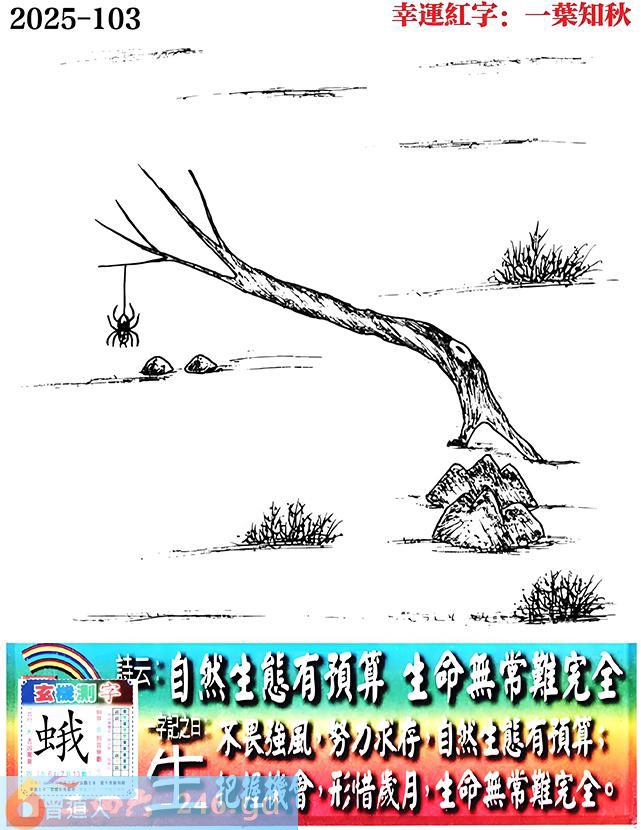 103期老版跑狗一字記之曰:【生】 詩雲:自然生態有預算,生命無常難完全。 不畏強風,努力求存,自然生悲有預算; 把握機會,形惜歲月,生命五常難完全。 玄機測字:《蛾》