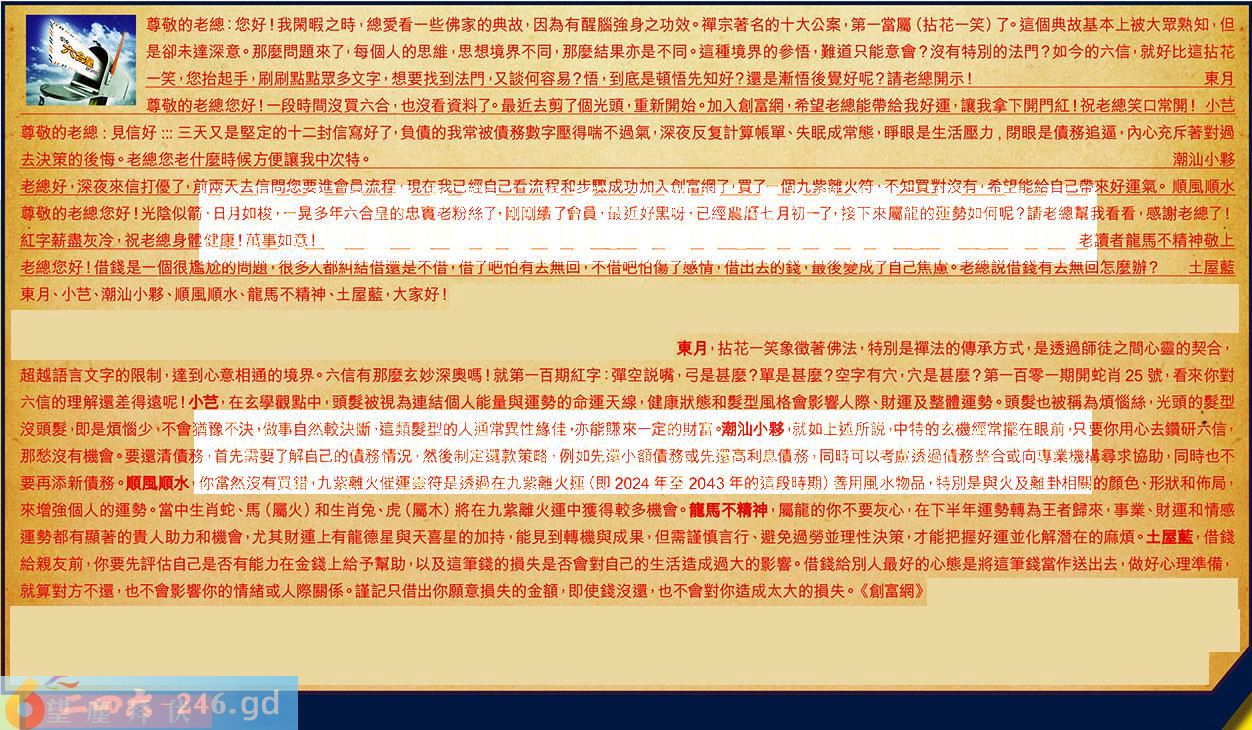 第105期《六合皇信箱文字版》10000%正確!!!正版二四六論壇*精心製作!!! 東月、小芑、潮汕小黟、順風順水、龍馬不精神、土屋藍,大家好! 【1】.尊敬的老總:您好!我閑暇之時,總愛看一些佛家的典故,因為有醒腦強身之功效。禪宗著名的十大公案,第一當屬(拈花笑)了。這個典故基本上被大眾熟知,但是卻未達深意。那麼問題來了,每個人的思維,思想境界不同,那麼結果亦是不同。這種境界的參悟,難道只能意會?沒有特別的法門?如今的六信,就好比這拈花二笑,您抬起手,刷刷點點眾多文字,想要找到法門,又談何容易?悟,到底是頓悟先知好?還是漸悟後覺好呢?請老總開示!東月 〖東月〗:拈花一笑象徵著佛法,特別是禪法的傳承方式,是透過師徒之間心靈的契合,超越語言文字的限制,達到心意相通的境界。六信有那麼玄妙深奧嗎!就第一百期紅字:彈空說嘴,弓是甚麼?單是甚麼?空字有穴,穴是甚麼?第一百零一期開蛇肖25號,看來你對六信的理解還差得遠呢! 【2】.尊敬的老總您好!一段時間沒買六合,也沒看资料了。最近去剪了個光頭,重新開始。加入創富網,希望老總能帶給我好運,讓我拿下開門紅!祝老總笑口常開!小芑 〖小芑〗:在玄學觀點中,頭髪被視為連結個人能量與運勢的命運天線,健康狀態和髪型風格會影響人際、財運及整體運勢。頭髪也被稱為煩惱絲,光頭的髪型沒髪鬢,即是煩惱少,不會猶豫不決做事自然較決斷,這類髪型的人通常異性緣佳,亦能賺來一定的財富。 【3】.尊敬的老總:見信好:::三天又是堅定的十二封信寫好了,負債的我常被債務數字壓得喘不過氣,深夜反复計算帳單、失眠成常態,睜眼是生活壓力,閉眼是債務追逼,內心充斥著對過去決策的後悔。老總您老什麼時候方便讓我中次特。潮汕小夥 〖潮汕小黟〗:就如上述所說,中特的玄機經常擺在眼前,只要你用心去鑽研六信,那愁沒有機會。要還清債務,首先需要了解自己的債務情況,然後制定還款策略,例如先還小額務或先還高利息僧務,同時可以考慮透過價務整合或向專業機構尋求協助,同時也不要再添新債務。 【4】.老總好,深夜來信打優了,前雨天去信問您要進會員流程,現在我已經自己看流程和步驟成功加入創富網了,買了一個九紫離火符,不知買對沒有,希望能給自己帶來好運氣。順風順水 〖順風順水〗:你當然沒有買錯,九紫離火催運靈符是透過在九紫離火運(即2024年至2043年的這段時期)善用風水物品,特別是與火及離卦相關的顏色、形狀和佈局,來增強個人的運勢。當中生肖蛇、馬(屬火)和生肖兔、虎(屬木)將在九紫離火運中獲得較多機會。 【5】.尊敬的老總您好!光陰似箭,日月如梭,一晃多年六合皇的忠老粉絲了,剛剛續了會員,最近好黑呀,已經農曆七月初一了,接下來龍的運勢如何呢?請老總幫我看看,感謝老總了!紅字薪盡灰冷,祝老總身體健康!萬事如意!老讀者龍馬不精神敬上 〖龍馬不精神〗:屬龍的你不要灰心,在下半年運勢轉為王者歸來,事業、財運和情感運勢都有顯著的貴人助力和機會,尤其財運上有龍德星與天喜星的加持,能見到轉機與成果,但需謹慎言行、避免過勞並理性決策,才能把握好運並化解潛在的麻煩。 【6】.老總您好!借錢是一個很尷尬的問題,很多人都糾結借還是不借,借了吧怕有去無回,不借吧怕傷了感情,借出去的錢,最後變成了自己焦慮。老總說借錢有去無回怎麼辦?土屋藍 〖土屋藍〗:借錢給親友前,你要先評估自己是否有能力在金錢上給予幫助,以及這筆錢的損失是否會對自己的生活造成過大的影響。借錢給別人最好的心態是將這筆錢當作送出去,做好心理準備,就算對方不還,也不會影響你的情緒或人際關係。謹記只借出你願意損失的金額,即使錢沒還,也不會對你造成太大的損失。 紅字:望塵拜伏 暗码:02223134 [释义]形容卑躬屈膝的神态。 [出处]《〈唐代佛教〉引言》