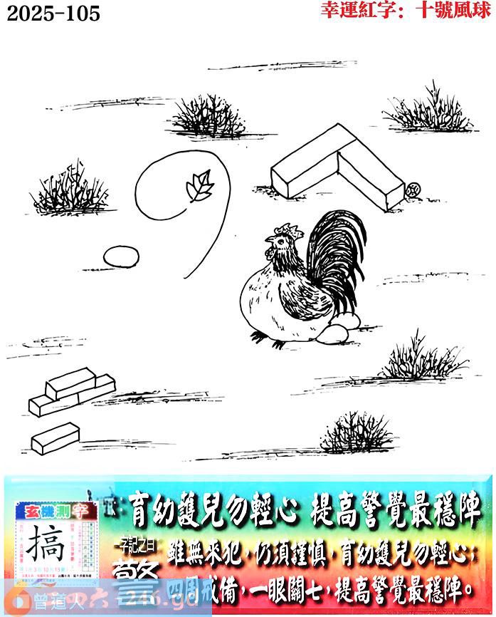 105期老版跑狗一字記之曰:【警】 詩雲:育幼護兒勿輕心,提高警覺最穩陣。 雖無來犯,仍須謹慎,育幼護兒勿輕心; 四周戒備,一眼關七,提高警覺最穩陣。 玄機測字:《搞》