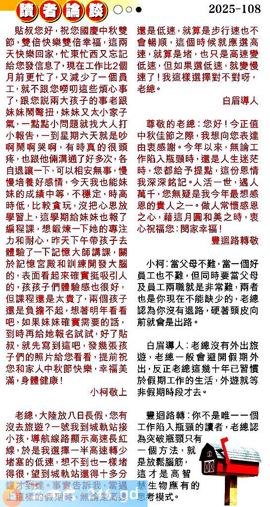 第一零八期讀者論談 1.貼叔您好,祝您國慶中秋雙節,雙倍快樂雙倍幸福,這兩天快樂回家,忙東忙西又忘記給您發信息了,現在工作比2個月前更忙了,又减少了一個員工,就不跟您唠叨這些煩心事了,跟您說兩大孩子的事老跟妹妹鬧警扭,妹妹又太小家子氣,一點點小問題就找大人打小報告,一到星期六天就是吵啊鬧啊哭啊,有時真的很頭疼,也跟他倆溝通了好多次,各自退讓下,可以相安無事,慢慢培養好感情,今天我也能妹妹的成績中等,不穩定,時高時低,比較貪玩,沒把心思放學習上,這學期給妹妹也報了編程課,想鍛煉一下她的專注力和耐心,昨天下午帶孩子去體驗了一下記憶大師講課,關於記憶宮殿和訓練開發大腦的,表面看起來確實挺吸引人的,孩孩子們體驗感也很好,但課程還是太貴了,兩個孩子還是負擔不起,想著明年看看吧,如果妹妹確實需要的話。到時再給她報名試試好了貼叔,就先寫到這吧,發幾張孩子們的照片給您看看,提前祝您和家人中秋節快樂,幸福美滿,身體健康!小柯敬上 〖小柯〗:當父母不難,當一個好員工也不難,但同時要當父母及員工兩職就是非常難,兩者也是你現在不能缺少的,老總認為你沒有退路,硬著頭皮向前就會是出路。 2.老總,大陸放八日長假,您有沒去旅遊?一號我到城軌站接小孩,導航線路顯示高速長紅線,於是我選擇一半高速轉少堵塞的低速,想不到也樣堵得很,望到城軌站還得十多分鐘才到達。事實告訴我,當遇上這樣的假期時,無論是高速還是低速,就算是步行速也不會暢順,這個時候就應選高速,就算是堵,也只是高速變低速,但如果選低速,就變慢速了!我這樣選擇對不對呀老總。白眉導人 〖白眉導人〗:老總沒有外出旅遊,老總一般會避開假期外出,反正老總這幾十年已習慣於假期工作的生活,外遊就等非假期時段才去。 3.尊敬的老總:您好!今正值中秋佳節之際,我想向您表達由衷感謝。今年以來,無論工作陷入瓶頸時,還是人生迷茫時,您都給予提點,這份恩情我深深銘記。人活一世,遇人萬千,您無疑是我今年最想感恩的貴人之一。做人常懷感恩之心,藉這月圓和美之時,衷心祝福您:閔家幸福!豐迴路轉敬 〖豐迴路轉〗:你不是唯一個工作陷入瓶頸的讀者,老總認為突破瓶頸只有一個方法,就是放鬆腦筋,這才是高智慧生物應有的思考模式。