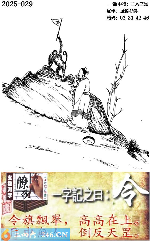 029期跑狗一字記之曰:【令】 令旗飄舉,高高在上。 目中無人,倒反天罡。