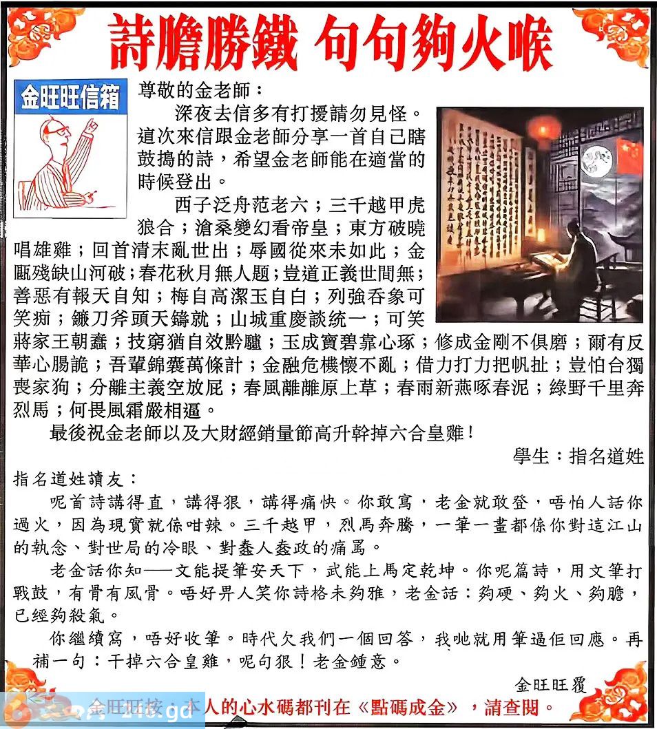 2025111期111期:金旺旺信箱彩民推荐→→《詩膽勝鐵 句句夠火候》