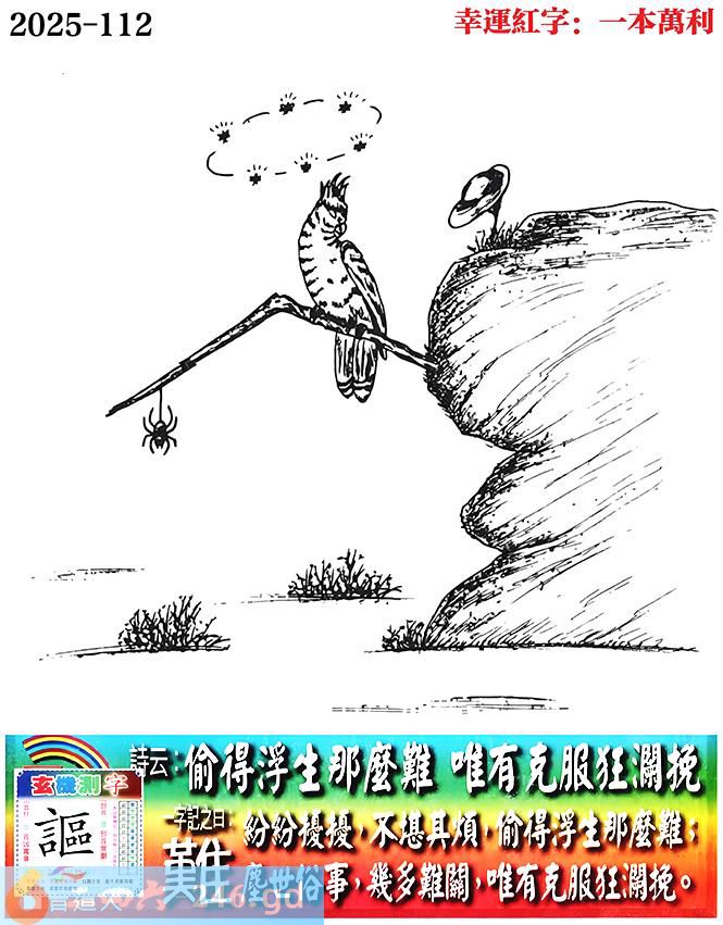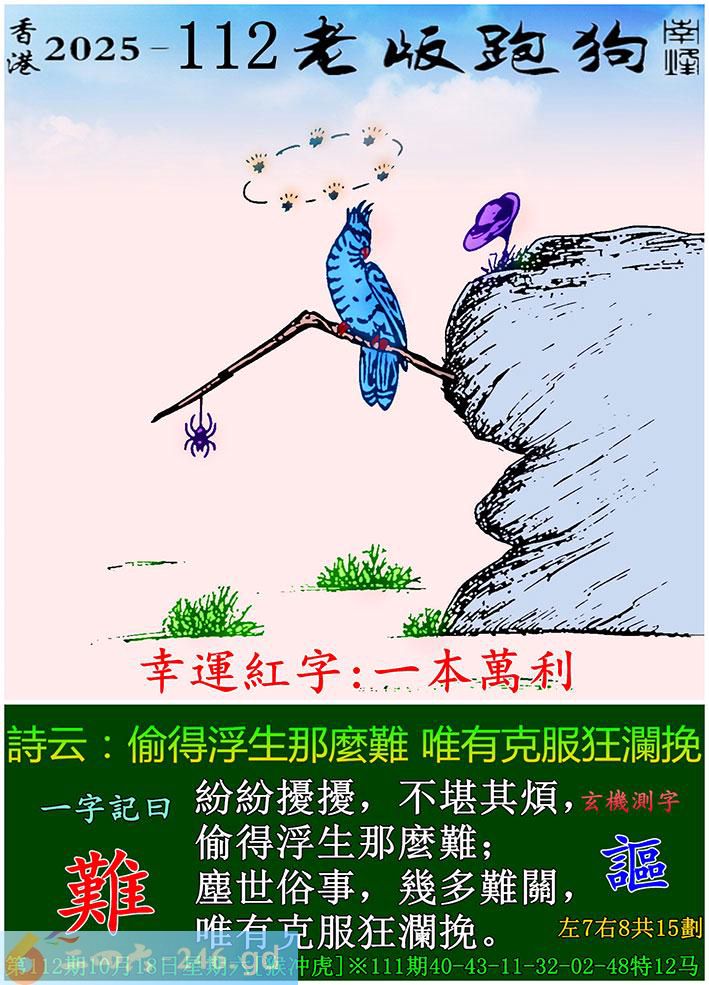 112期老版跑狗一字記之曰:【難】 詩雲:偷得浮生那麼難,唯有克服狂瀾挽。 紛紛擾擾,不堪其煩,偷得浮生那麼難; 塵世俗事,幾多難關,唯有克服狂瀾挽。 玄機測字:《謳》