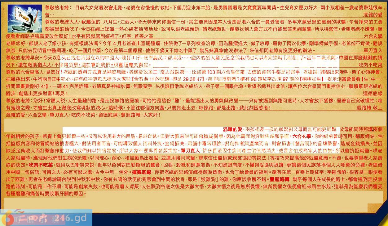 第112期《六合皇信箱文字版》10000%正確!!!正版二四六論壇*精心製作!!! 混雜的愛、六合玄學、單刀直入、吃肉不吃菜、道德底線、豐迴路轉,大家好! 【1】.尊敬的老總:目前大女兒還沒會走路,老婆在家慢慢的教她。下個月迎來第二胎,是男寶寶還是女寶寶要等開獎。生兒育女壓力好大,兩小孩相差一歲老婆帶娃很辛苦...混雜的愛 〖混雜的愛〗:兩孩相差一歲的狀況對父母而言可能更輕鬆,父母能同時照護兩個年齡相近的孩子,感覺上會更輕鬆一些。又可以沿用老大的用品、易於育兒。但對大寶來說可能會造成衝擊,因為他需面對分離焦慮和爭寵。 【2】.尊敬的老總大人、我屬兔的,八月生,江西人。今天特來向你寫信一份,其主要原因是本人也是香港六合的一員受害者,多年來蒙受黑莊黑網的欺騙、辛苦掙來的工資都被黑莊給吃了、今日在網上認識一熱心網友給我地址,說可以跟老總傾訴,請老總幫助,還能找到入會方式不再被黑莊黑網蒙騙,所以特寫信。希望老總不嫌棄,順便看看網路名稱需要改什麼好!水平有限就寫到這裡了。紅字:首善之區六合玄學 〖六合玄學〗:你的網名暫時可用,翻版網站,包括盗版內容和仿冒網站的禍害極大,對使用者而言可能導致個人資料外洩、金錢損失、電腦中毒等風險;對創作者與產業而言,則會損害《創富網》的品牌聲譽、造成金錢損失,並因缺乏足夠收入而打擊創作動力,使我們難以持續發展,所以大家不要再看翻版網站。 【3】.老總您好,都說人老了像小孩,有這樣說法嗎?今年4月老爸查出直腸腫瘤,住院做了一系列檢查冶療,因為腫瘤過大做了放療,還做了兩次化療,剛準備做手術,老爸卻不肯做,勸說無奈,只能去昆明看中醫調理吃了一個月中藥,今次是第二個療程,他說不痛又不肯吃中藥了,幾兄妹真拿他沒辦法了,來信想問老總有沒更好的辦法。單刀直入 〖單刀直入〗:許多長輩因生病而產生價值感消失,或是害怕成為家人的負擔,所以會抗拒就醫。哄老人家就醫時,應理解他們對生病的恐懼,以同理心、耐心、和鼓勵為出發點,並運用陪同就醫、尋求信任醫師或親友協助等說法」等技巧來提高他的就醫意願。不過,也要尊重老人家最終的決定。 【4】.尊敬的老總早安。今天以色列已經在清退在以的中國人,連打工仔底層農民工都清退......國內的猶太難民紀念館我們也可以考慮適時「清退」了。當年二戰期間,中國在那麼艱難的情況下,還在救助猶太人,不懂得感恩還在算計我們。現實版農夫與蛇。吃肉不吃菜 〖吃肉不吃菜〗:就用以巴衝突來說,近年以色列對巴勒斯坦的蠶食、凶狠、殺戮和肆意妄為,不知進退有度,不懂得妥協與退讓,更讓這個民族落得個人人唾棄的命運,老總借用中國一句俗語:可憐之人,必有可恨之處,古今中無一例外。 【5】.尊敬的六合皇高人,見信好!老總的透料方式其是神威無敵,老總要說第二,没人敢說第一,比如第103期六合皇信箱:去信的雞狗牛都是好幫手,老總說雞都出來啼叫,弟子心領神會,把雞挑出來,牛狗兩肖正中靶心,還有紅字節意思提示大家猜【合數為11的號碼,即是29.38.47】,弟子猜得對嗎?還有96期紅字改用97期的【栩栩如生】。提示創富會員看【生:牛一:拆開筆畫數剛好41】,一碼41完美詮釋,老總真是神機妙算,無敵聖手,以後誰再敢說老總坑人,弟子第一個跟他急。希望老總登出此信,讓各位六合皇同門重拾信心,繼續緊跟老總的腳步,創造出更多財富!再見!道德底線 〖道德底線〗:你把老總的思路演繹得頗為透徹,也合乎給會員的福利。還有在第一百零七期紅字:字斟句酌,很容易一眼便看出了酉雞。再者在老總論碼內說到仲秋和中秋,你有共鳴的話便能夠意會到中間的秋肖,即是「猴雞狗」的雞,你應該收穫不錯。 【6】.尊敬的老總:您好!常聽人說人生最難的路,是走投無路的絕境。可恰恰是這份“難”,最能逼出人的勇氣與改變——只有被逼到無路可退時,人才會放下猶豫、逼著自己突破慣性;唯有落魄之際,才會生出真正徹底改寫現狀的決心。這時候,不管往哪個方向邁,只要肯走出去,每條路,都是出路。致此刻困惑者!豐迴路轉敬上 〖豐迴路轉〗:幾乎每個人在成長的路上,都會遇到走投無路的時刻。可能是工作不順,可能是創業失敗,也可能是遭人背叛,人在跌到谷底之後是大徹大悟,大徹大悟之後是無所畏懼,無所畏懼之後便會迎來風生水起,這就是為甚麼我們遭受各種磨難和痛苦時要咬緊牙關的原因。 紅字:呼朋引類 暗码:09151942 [释义]指招引志趣相同的人。 [出处]宋·欧阳修《憎苍蝇赋》:“奈何引类呼朋,摇头鼓翼。”