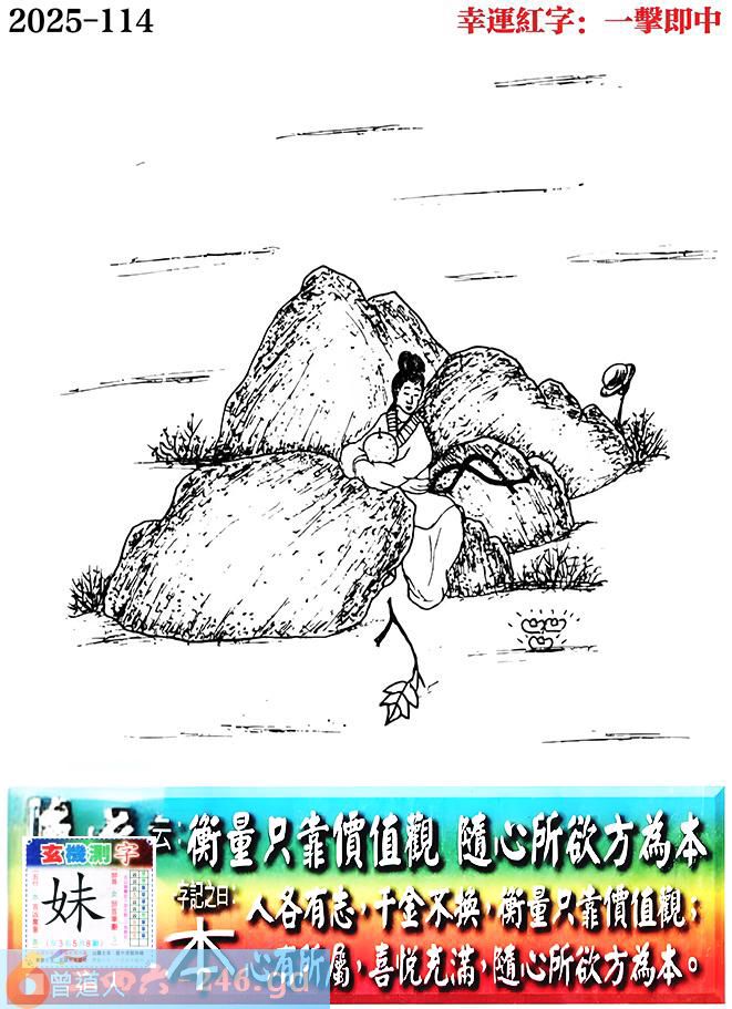 114期老版跑狗一字記之曰:【本】 詩雲:衡量只靠價值觀,隨心所欲方為本。 人各有志,千金不換,衡量只靠價值觀; 心有所屬,喜悅充滿,隨心所欲方為本。 玄機測字:《妹》