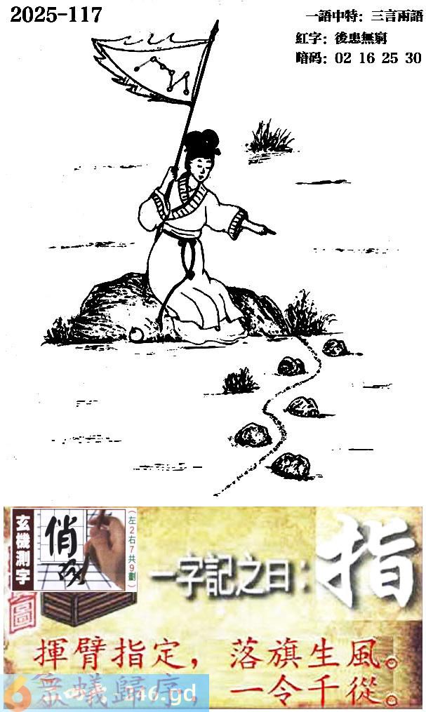 117期跑狗一字記之曰:【指】 揮臂指定,落旗生風。 眾蟻歸序,一令千從。 玄機測字:《俏》 一語中特:三言兩語