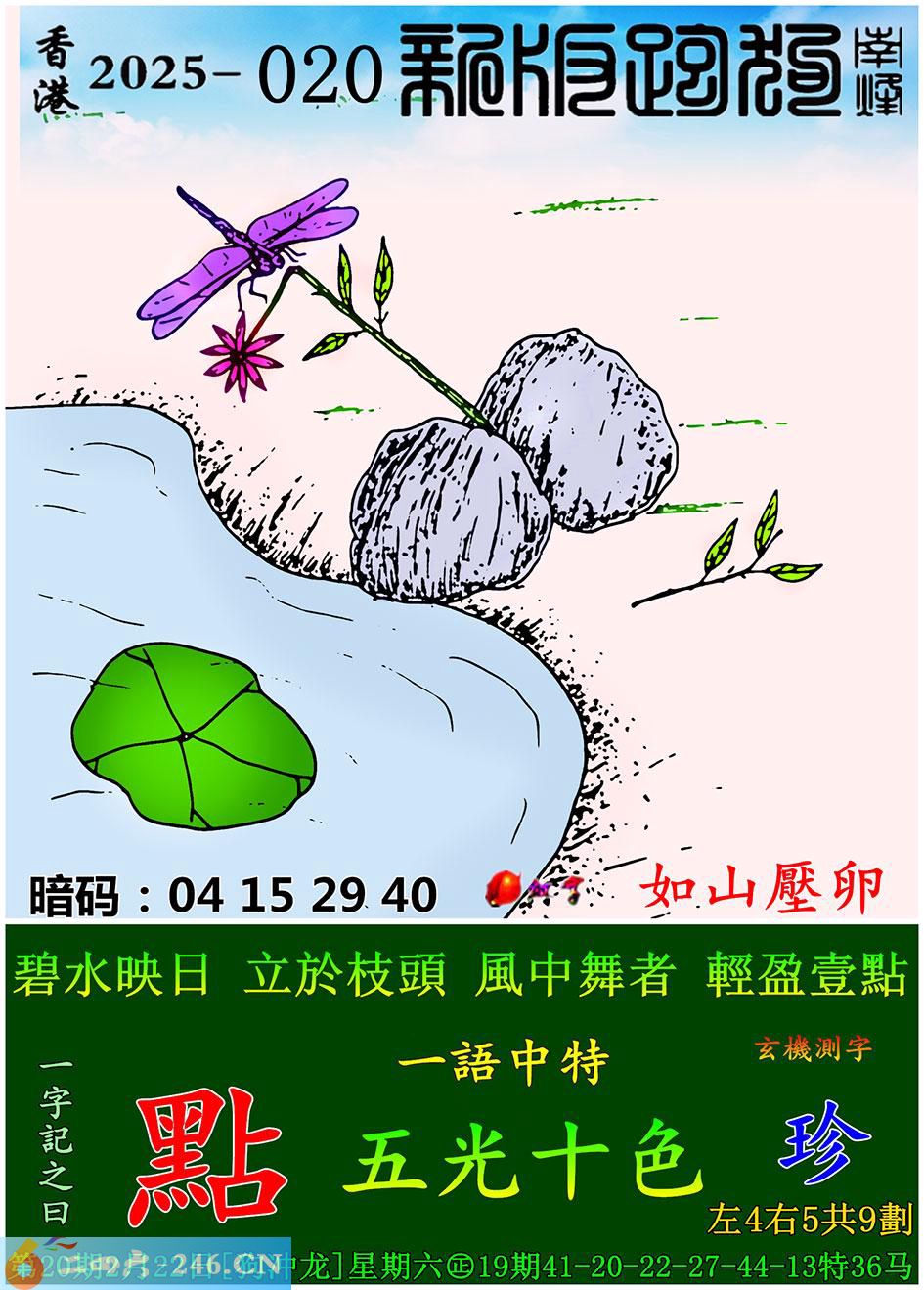 020期跑狗一字記之曰:【點】 碧水映日,立於枝頭。 風中舞者,輕盈壹點。 玄機測字:《珍》 一語中特:五光十色