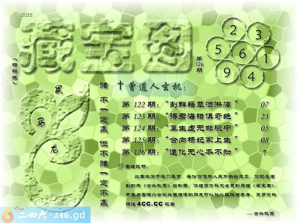 126期藏寶圖 新:造化无心本不知 老:流到前溪无半语 禁:兔 禁:8尾 玄機字:《离》