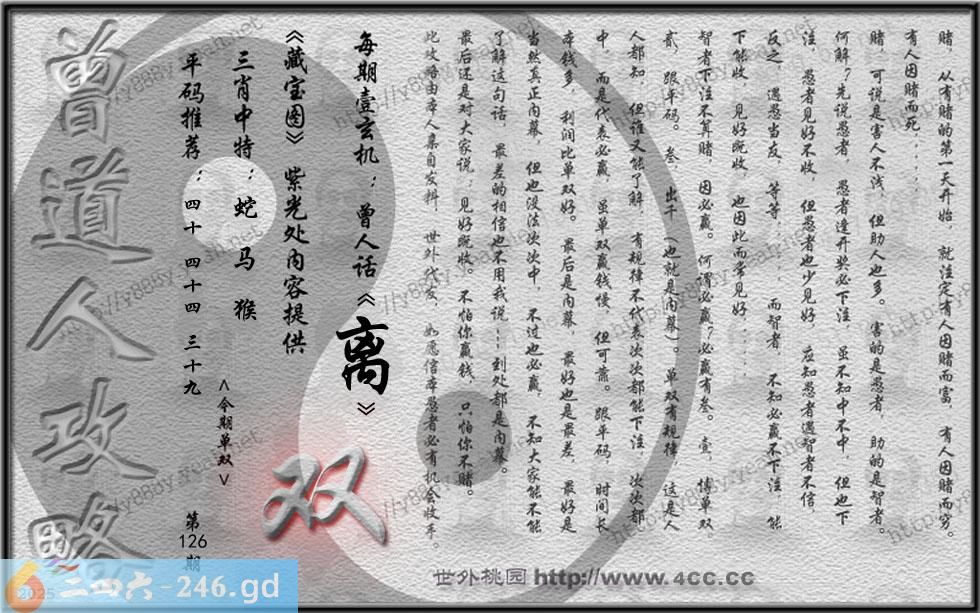 126期藏寶圖 新:造化无心本不知 老:流到前溪无半语 禁:兔禁:8尾玄機字:《离》