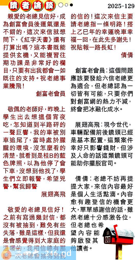 第一二九期讀者論談 1.親愛的老總見信好,成為創富會員後運氣還是不錯的,這次來信就想問下,《紅字天書》還有打算出嗎?這本書既能提供玄機,又能複習往期功課是非常好的欄目,只要有出我都會一如既往的支持。祝老總事業騰飛!創富老會員 〖創富老會員〗:這個問題應該要發給六信老總更為適合,但老總認為一切皆有可能,只要你們對創富網的熱力不減,終會把冰融化成水。 2.敬佩的老師好,昨晚上學生出去想溫個宵夜吃,怎知道到半路砰的一聲巨響,我的車被別車追尾了,當時處於朦朧的環境,沒怎麼看的清楚,就看到是桂的藍色牌照,以為他停了會下車,沒想到他找了,學生們立即報警,希望兕警,幫我歸警展翅高飛 〖展翅高飛〗:現今世代,車輛配備前後鏡頭已經是基本配置,這類案件幸好只影響錢財,但涉及人命的話這類鏡頭可能助你擺脱官司。 3.敬愛的老總見信好!之前有寫過幾封信,都沒有被抽到,難免有些失落,雖是這樣,但我還是會感覺得到大家庭的溫暖的,我相信總有那麼一次老總會抽得到我的信的!這次來信主要請老總指一條明路!搭上乙巳年的幸運晚車幸福一回,在此先多謝先!祝貼報一路長虹!倩倩 〖倩倩〗:老總不妨再提提大家,來信內容最好是個人生活點滴。內容愈有趣登信的機會更大,單單感謝信的話,雖然老總十分感激各位,但老總也希望內容能夠啟發其他讀者。