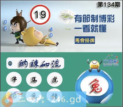 134期正版彩图挂:19爆:兔挂牌成语:纳谏如流挂牌出肖:牛马虎蛇兔猪