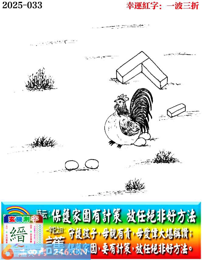 033期老版跑狗一字記之曰:【護】 詩雲:保護家園有計策,放任絕非好方法。 守護孩子,母親有責,母愛偉大堪稱讚; 保護家園,要有計策,放任絕非好方法。 玄機測字:《縉》