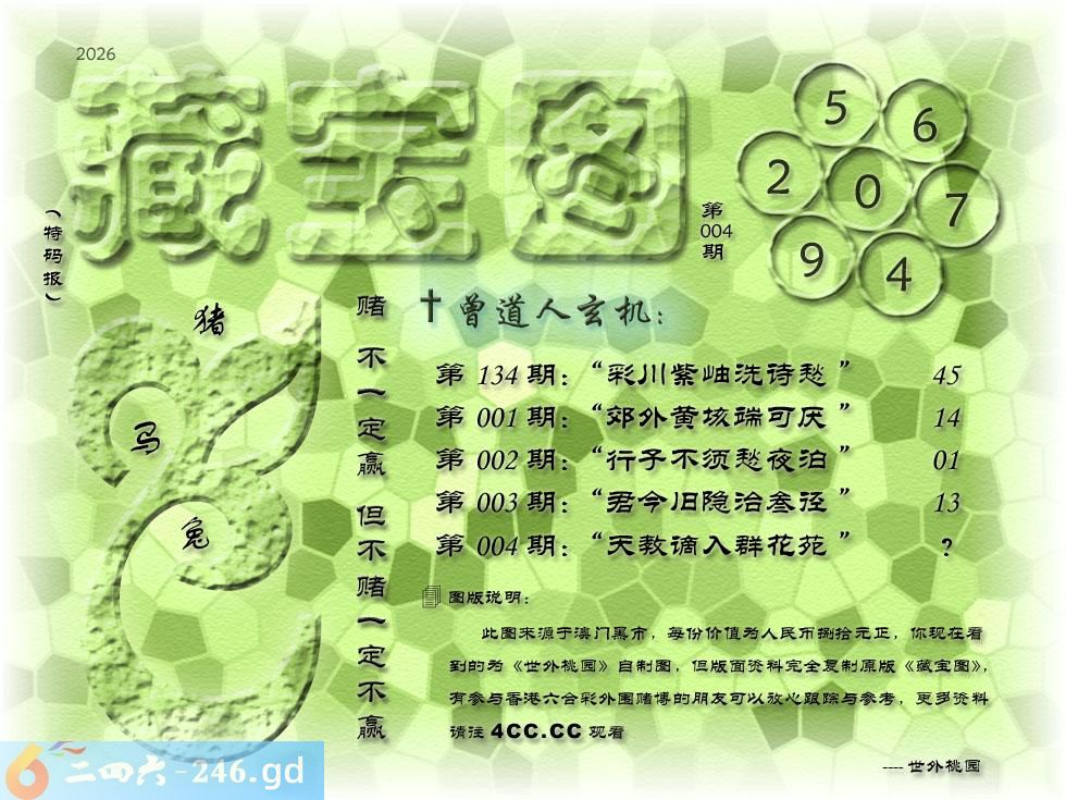 004期藏寶圖 新:天教谪入群花苑 老:乌蒙磅礴走泥丸 禁:狗 禁:1尾 玄機字:《收》
