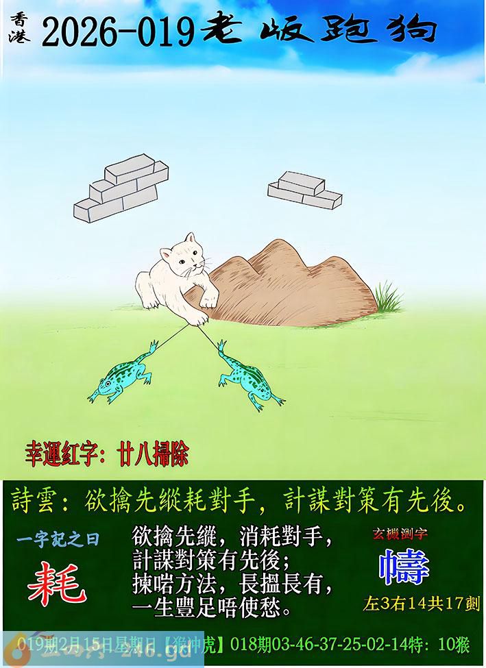 019期老版跑狗一字记之曰:【耗】 诗云:欲擒先纵耗对手,计谋对策有先后。 欲擒先纵,消耗对手,计谋对策有先后; 拣啱方法,长搵长有,一生丰足唔使愁。--------- 个人看好一肖【鸡】,一码【09】。 祝各位在新的一年里,事业如万马奔腾,气势如虹;生活似策马扬鞭,一往无前。马到成功,阖家安康!--------