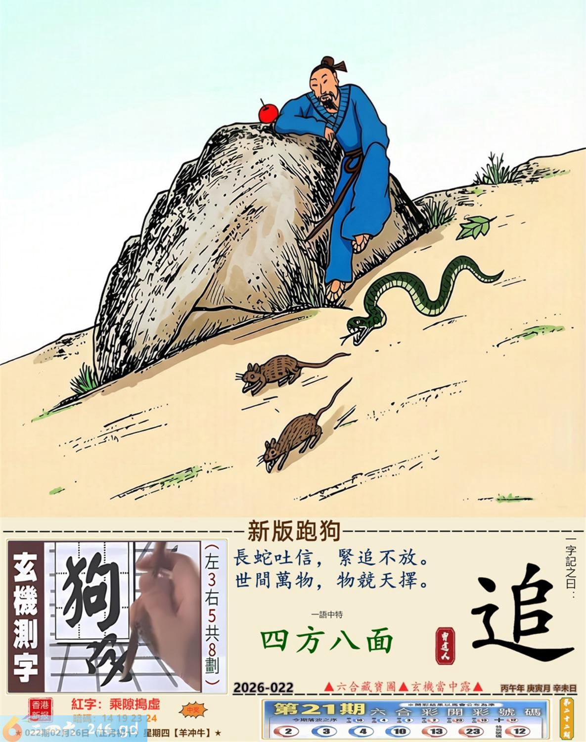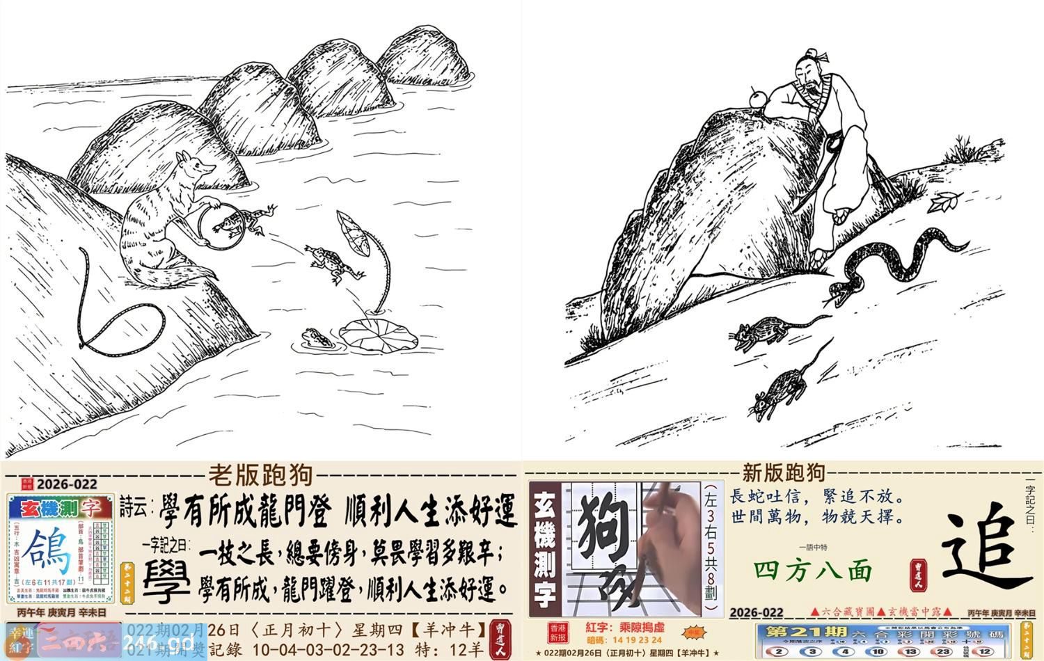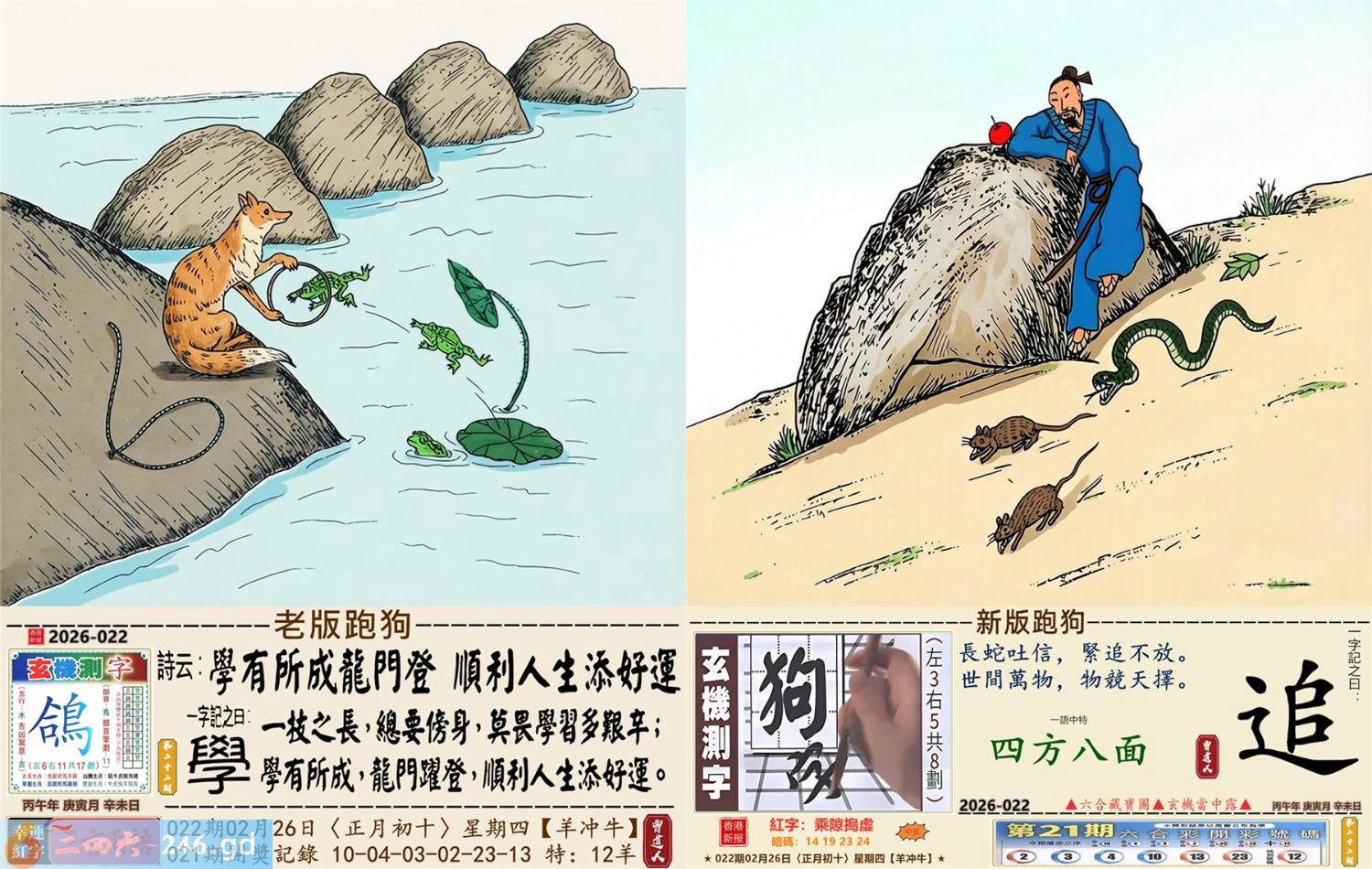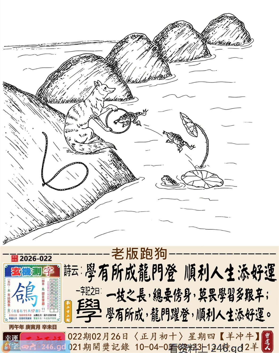 2026年2月26日022期牛(乙丑)(路旁土) 022期:老版跑狗玄機一字記之曰:【學】 詩云:學有所成龍門登順利人生添好運 一技之長,總要傍身,莫畏學習多艱辛; 學有所成,龍門躍登,順利人生添好運。 玄機測字:《鴿》 密圖詩:鳥引花迎到寺門 《記》:一庭花影弄三更 特碼大小單雙句:假期過后胖三斤 今期必中:張遼 022期:特碼歇后語 葵花的盘子-----老转向 022期正版四字梅花诗:装聋作哑。 022期火车头:烧伤羊。诗:猪死鼠伤,一八开出数必奇。 022期香港第一手欲钱料:火。 022期曾道人说:“几块?” 022期另版四字梅花诗:皇上万岁。 022期香港第一手欲钱料:欲钱找有牙没口的动物。 022期曾道人说:“为什么汽车四轮会跑得最快”? 022期:二字经:蓝红。 022期:北斗星是特码 022期:智力金壤;声色犬马 022期:信箱紅字:【乘隙搗虛】 022期:【暗碼:14-19-23-24】 022期:一語中特:【四方八面】 發財玄機圖:緊隨其後藏頭露尾圖中明狗鼠藍綠 022期:藏寳圖 新:须牧生民始入来 老:小君山上玉蟾生 禁:鼠禁:5尾玄機字《靛》 2026年022期【生活幽默】版 〖不能用手〗 妻一個醫生走在街上。對面跑來個小伙子,撞在醫生身上,把他撞倒了。醫生大怒,站起來拉住小伙子,舉手就要打。小伙子忙説:"您用脚踢我吧!請千萬别用手打。"醫生問:"爲什?"小伙子説:"人家説您用脚踢喪不了命,可一經您的手就没命了。"