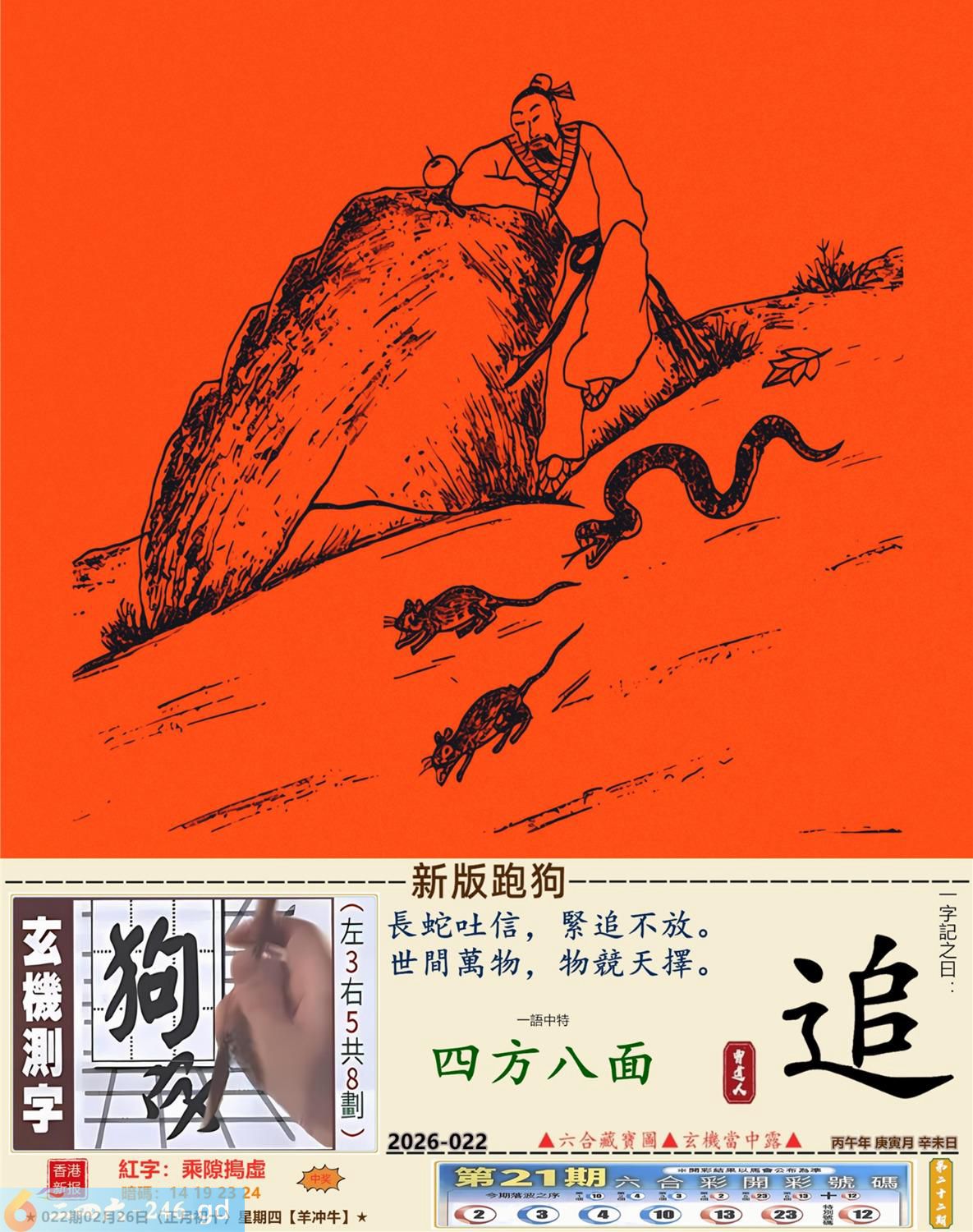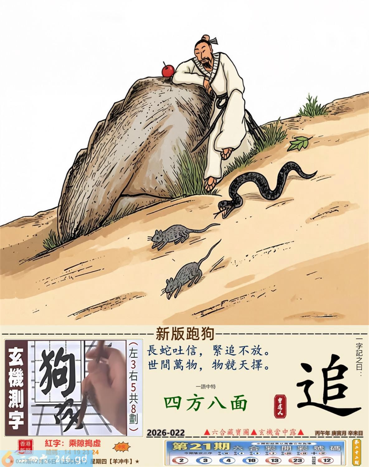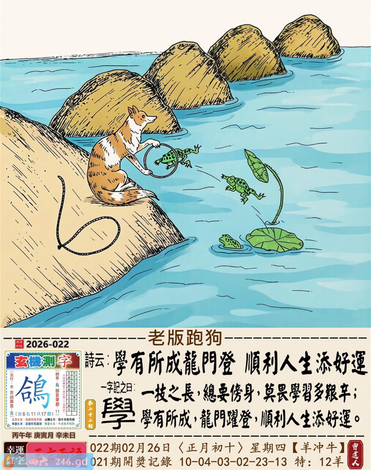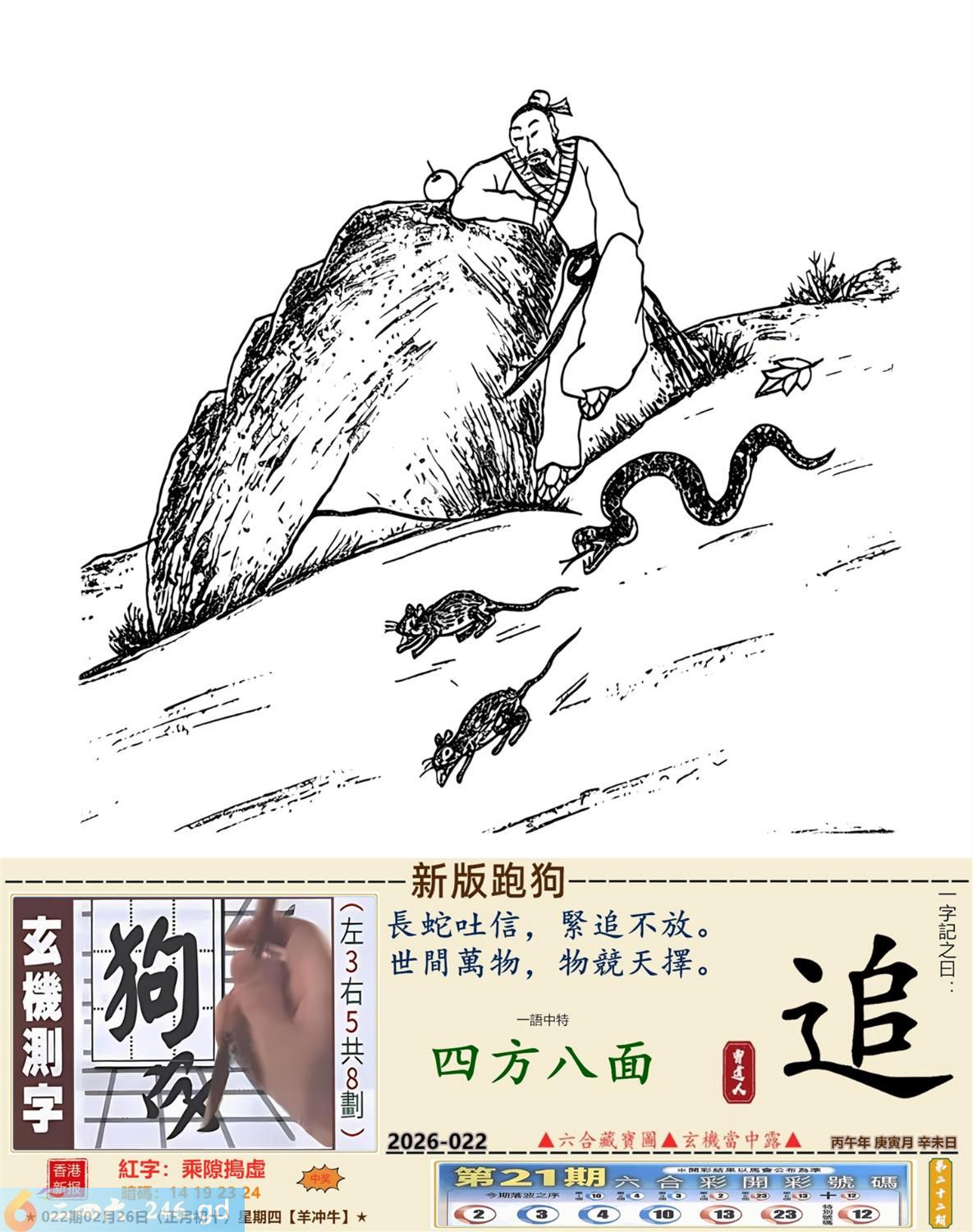 2026年2月26日022期牛(乙丑)(路旁土) 022期:老版跑狗玄機一字記之曰:【學】 詩云:學有所成龍門登順利人生添好運 一技之長,總要傍身,莫畏學習多艱辛; 學有所成,龍門躍登,順利人生添好運。 玄機測字:《鴿》 密圖詩:鳥引花迎到寺門 《記》:一庭花影弄三更 特碼大小單雙句:假期過后胖三斤 今期必中:張遼 022期:特碼歇后語 葵花的盘子-----老转向 022期正版四字梅花诗:装聋作哑。 022期火车头:烧伤羊。诗:猪死鼠伤,一八开出数必奇。 022期香港第一手欲钱料:火。 022期曾道人说:“几块?” 022期另版四字梅花诗:皇上万岁。 022期香港第一手欲钱料:欲钱找有牙没口的动物。 022期曾道人说:“为什么汽车四轮会跑得最快”? 022期:二字经:蓝红。 022期:北斗星是特码 022期:智力金壤;声色犬马 022期:信箱紅字:【乘隙搗虛】 022期:【暗碼:14-19-23-24】 022期:一語中特:【四方八面】 發財玄機圖:緊隨其後藏頭露尾圖中明狗鼠藍綠 022期:藏寳圖 新:须牧生民始入来 老:小君山上玉蟾生 禁:鼠禁:5尾玄機字《靛》 2026年022期【生活幽默】版 〖不能用手〗 妻一個醫生走在街上。對面跑來個小伙子,撞在醫生身上,把他撞倒了。醫生大怒,站起來拉住小伙子,舉手就要打。小伙子忙説:"您用脚踢我吧!請千萬别用手打。"醫生問:"爲什?"小伙子説:"人家説您用脚踢喪不了命,可一經您的手就没命了。"