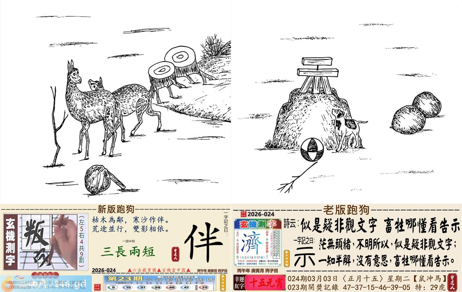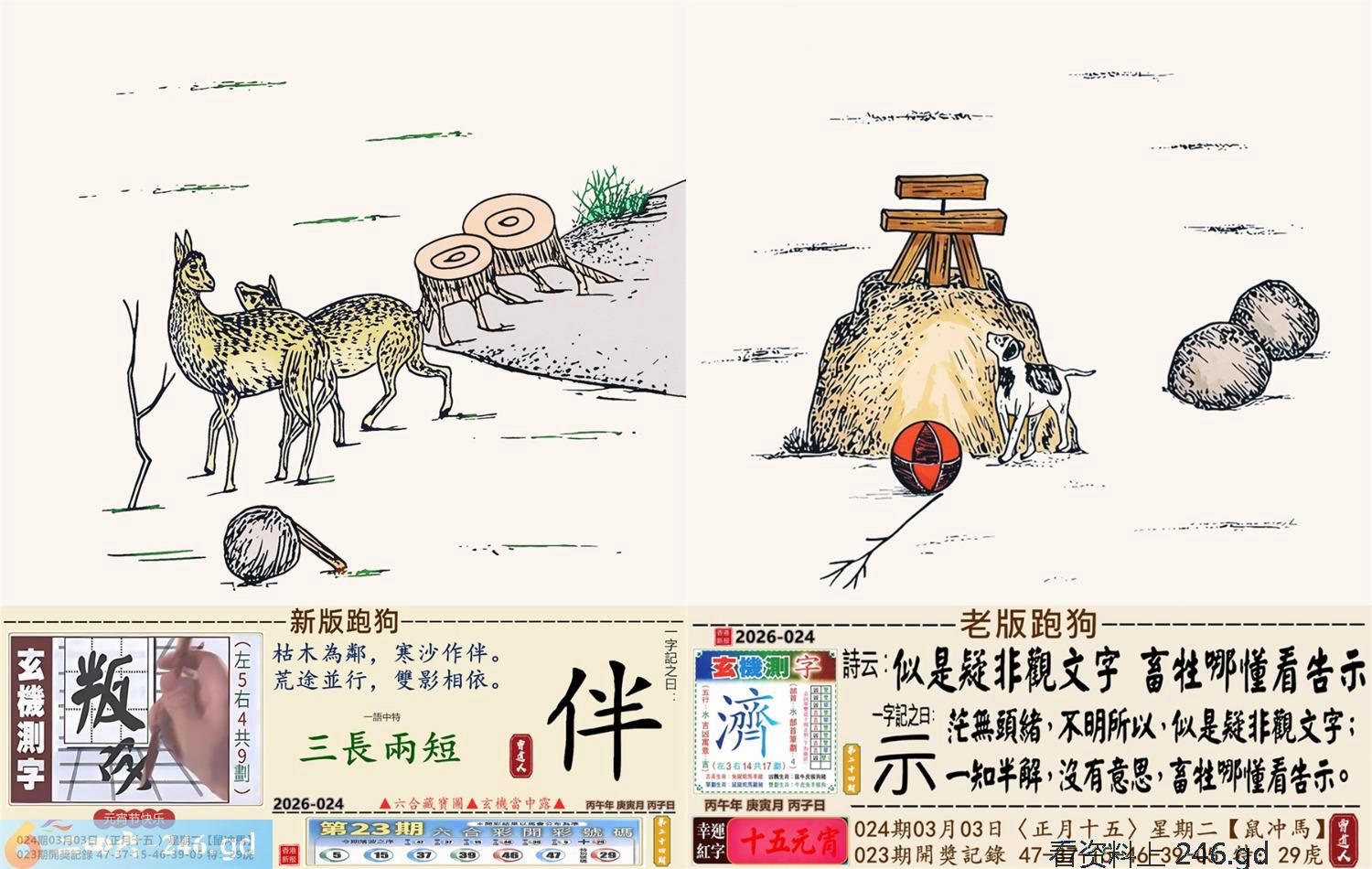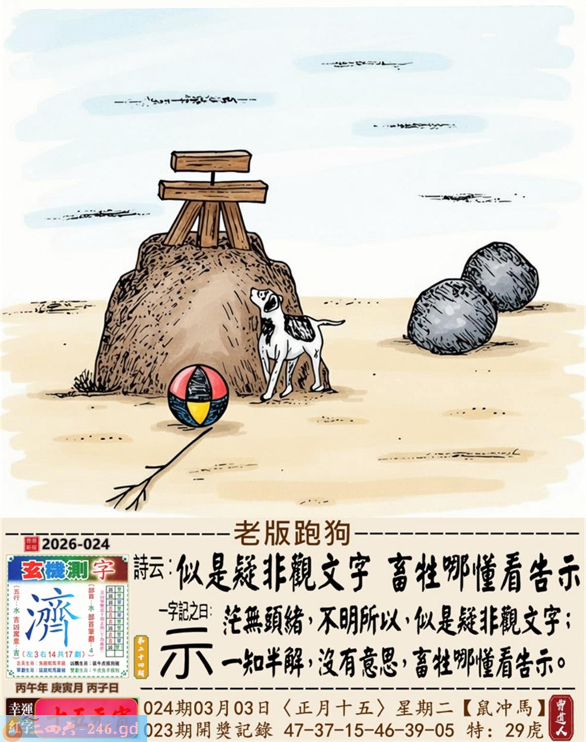 2026年3月3日024期丙午(马)(涧下水) 024期:老版跑狗玄機一字記之曰:【示】 詩云:似是疑非觀文字畜牲哪懂看告示 茫無頭緒,不明所以,似是疑非觀文字; 一知半解,沒有意思,畜牲哪懂看告示。 玄機測字:《濟》 密圖詩:獨看密圖到三更 《記》:雙紅開行二十四 特碼大小單雙句:彩禮要十萬 今期必中:馬鐵 024期:特碼歇后語 稀泥蛋子-----软货 024期正版四字梅花诗:闻鸡起舞。 024期火车头:烧伤狗。诗:虎死狗伤,一七一八比短长。 024期香港第一手欲钱料:春秋战国。 024期曾道人说:“耳机?” 024期另版四字梅花诗:海豚潜水。 024期香港第一手欲钱料:欲钱找世界上最美的女人。 024期曾道人说:“为什么人人都要大便”? 024期:绿红。 024期:四川是特码 024期:智力金壤; 024期:信箱紅字:【昂然直進】 024期:【暗碼:15-34-37-42】 024期:一語中特:【三長兩短】 發財玄機圖:爆發發力動作猛烈圖中明虎藍綠 024期:藏寳圖 新:风雷多向庙中来 老:当初不合轻分散 禁:羊禁:5尾玄机字《弃》 2026年024期【生活幽默】版 〖比丑〗 有一天,三個相貌醜陋的人在一起閑聊,他們要用一句成語來形容自己奇醜無比。甲説:我的長相太隨心所欲了,所以我很醜。 乙説:那也不如我長得爲所欲爲我更 醜。 丙説:你們都别争了,就我這長相绝對下不爲例了,所以我最醜!