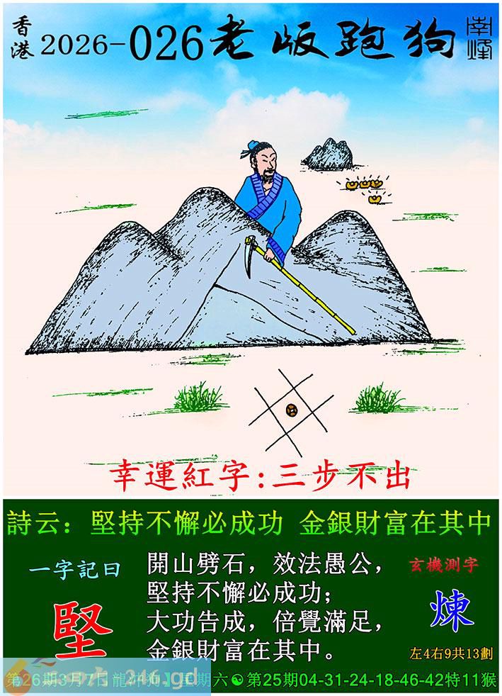 026期老版跑狗一字記之曰:【堅】 詩雲:堅持不懈必成功,金銀財富在其中。 開山劈石,效法愚公,堅持不懈必成功; 大功告成,倍覺滿足,金銀財富在其中。 玄機測字:《煉》