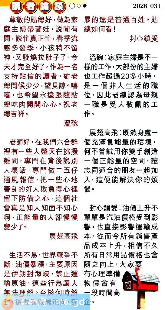 第031期讀者論談 1.尊敬的貼總好,做為家庭主婦帶著娃,説閒有閒,説忙真正忙,春季流感多發季,小孩稍不留神,又發燒拉肚子了,今天才完全好了。作為一名支持貼信的讀者,對老總問候少少,望見諒。嘻嘻,也希望永遠跟隨貼總吃肉開開心心。祝老總吉祥。溫碗 〖溫碗〗:家庭主婦是不一樣的工作,大部份的主婦也工作超過20多小時,是一個非人生活的職位,因此老總認為母親一職是受人敬佩的工作。 2.老師好,在我們六合群裡有一些人整天在挑撥離間,專門在背後説別人壤話,專門做二五仔通風報信,把一些心地善良的好人欺負得心裡留下防備之心,這個社會真是知人知面不知心啊,正能量的人卻慢慢變少了。展翅高飛 〖展翅高飛〗:既然身處一個充滿負能量的環境,何不嘗試用你雙手創造一個正能量的空間,讓志同道合的朋友一起加入,這便能解決你的煩惱。 3.生活不易,世界戰爭不斷,油價暴漲,主要原因是伊朗封海峡,禁止運輸原油,這些行為讓人無法理解。至於何時解封,還要看戰局走向,受累的還是普通百姓。貼總如何看!封心鎖愛 〖封心鎖愛〗:油價上升不單單是汽油價格受到影響,也直接影響運輸成本,從而令所有銷售產品成本上升,相信不久所有日常用品價格也會隨之向上,大家要有心理準備物價會有一段時間高企。