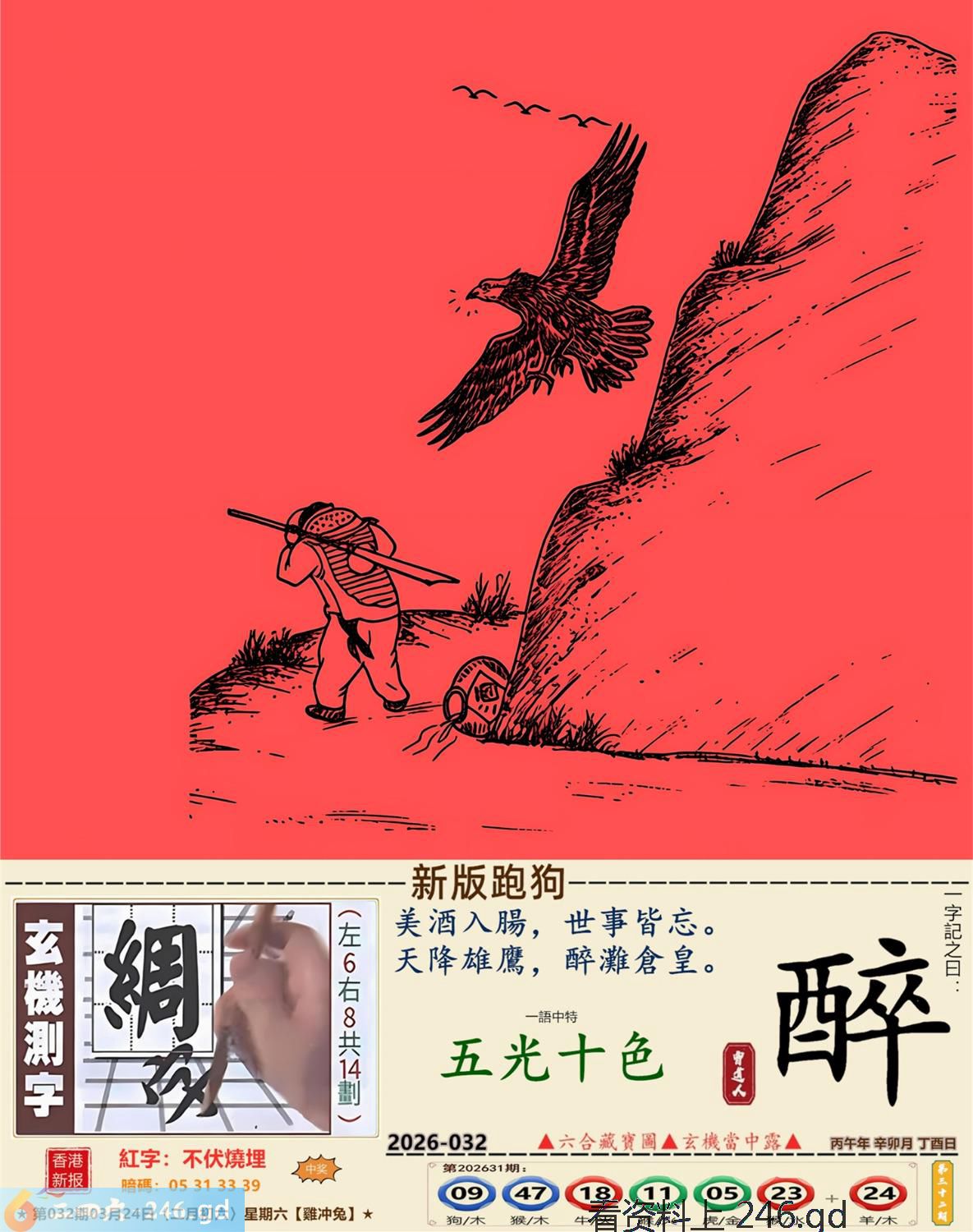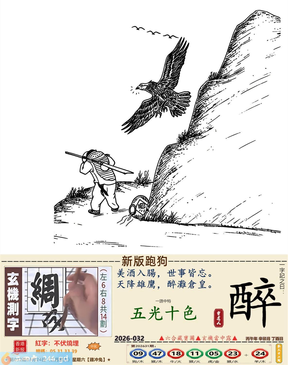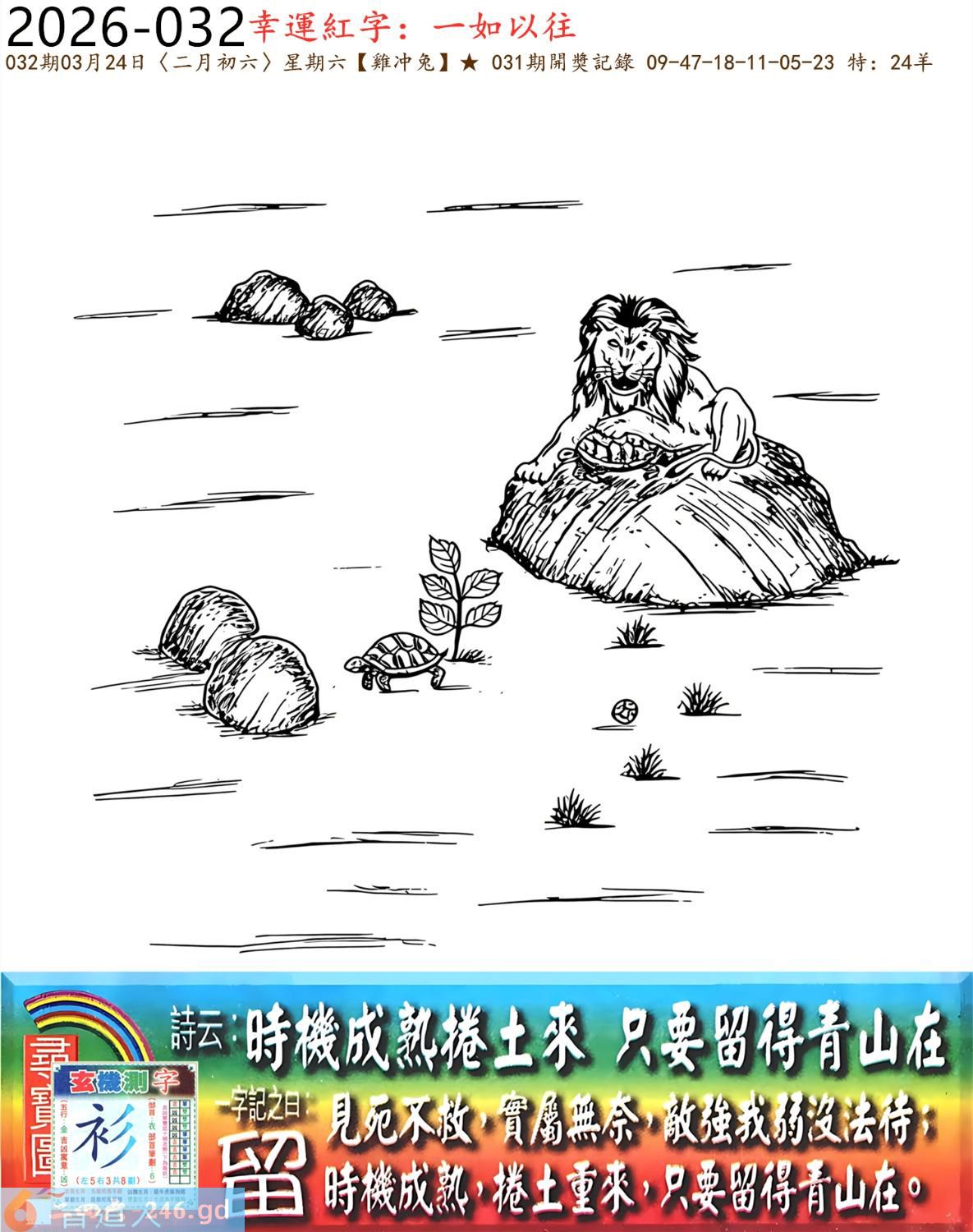本帖最后由小歪于2026-3-2317:57编辑 2026年3月24日星期二山下火雞日沖兔 032期:老版跑狗玄機一字記之曰:【留】 詩云:時機成熟捲土來,只要留得青山在。 見死不救,實屬無奈,敵強我弱沒法待; 時機成熟,捲土重來,只要留得青山在。 玄機測字:《衫》 密圖詩:會上領導一席話 記:八仙賀喜到門前 特碼大小單雙句:小打小鬧 今期必中:孫權 032期:特碼歇后語 过时的药----失效了 032期正版四字梅花诗:满头大汗。 032期火车头:烧伤马。诗:龙死鸡伤,三六两边二一来。 032期香港第一手欲钱料:三天打鱼?。 032期曾道人说:“蛇?” 032期另版四字梅花诗:没事找事。 032期香港第一手欲钱料:欲钱看小学生做早操的样子。 032期曾道人说:“怎么样的男人对美女最感兴趣”? 032期:二字经:绿红。 032期:大门有特码 032期:智力金壤:來龍去脈 030期:信箱紅字:【不伏燒埋】 030期:【暗碼:05313339】 030期:一語中特:【五光十色】 發財玄機圖:預備進攻頸部抬起圖中明蛇紅綠 032期:藏寶圖 新:大耳胡僧同笑语 老:玖天开出壹成都 禁:牛禁:9尾玄機字《韶》 2026年032期【生活幽默】版 〖藥方〗 一位七十歲的老人向醫生訴說自己的困境:"最近我和一位二十六歲的美麗女郎結了婚,但每晚衹要一上床,我很快就會睡去。" 醫生草草開了一張藥方,遞給病人。病人的臉上露出喜氣:"醫生,你的意思是我能够......" "不,"醫生打斷了他,"這藥是給她的,我對你無能爲力,但至少必須讓她也能睡得着。"
