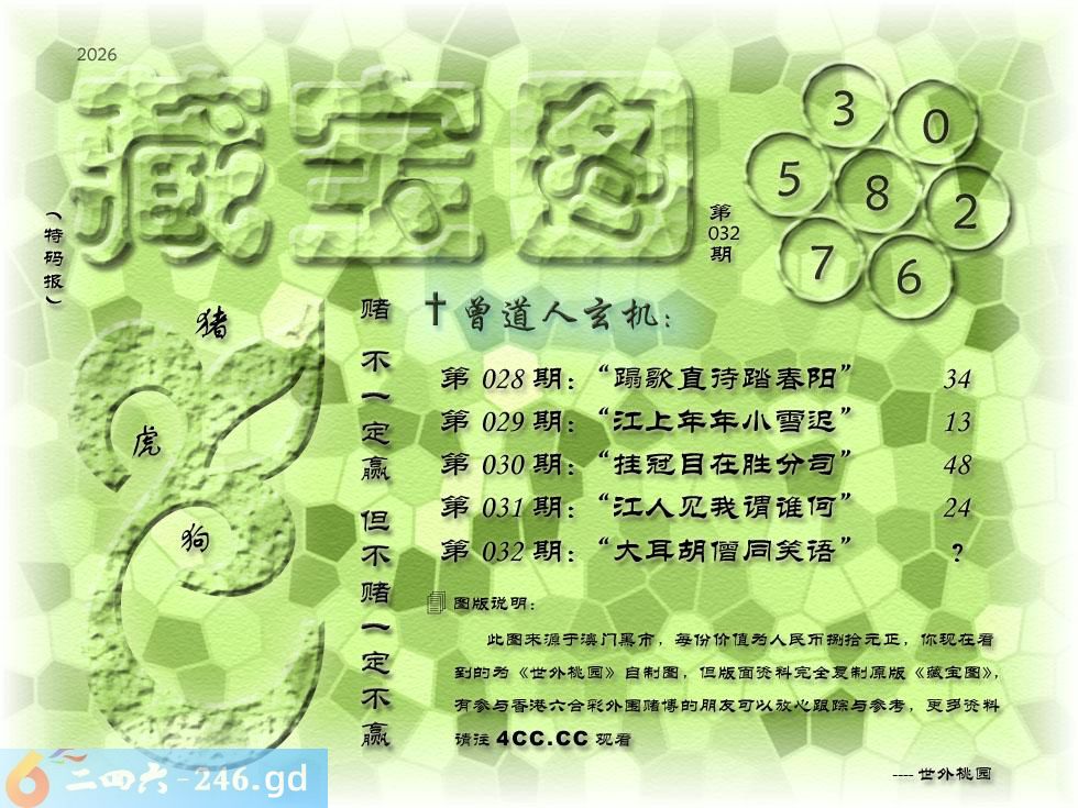 032期藏寶圖 新:大耳胡僧同笑语 老:玖天开出壹成都 禁:牛禁:9尾玄機字:《韶》