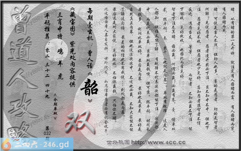 032期藏寶圖 新:大耳胡僧同笑语 老:玖天开出壹成都 禁:牛 禁:9尾 玄機字:《韶》
