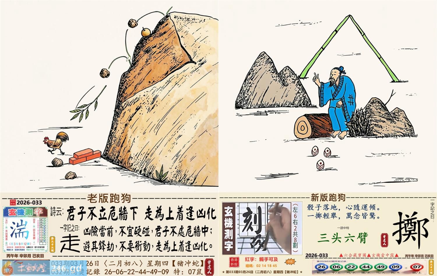 本帖最后由小歪于2026-3-2610:50编辑 3月26日星期四平地木豬日沖蛇 033期:老版跑狗玄機一字記之曰:【走】 詩云:君子不立危牆下,走為上招逢凶化。 凶險當前,不宜硬碰,君子不立危牆下; 避其鋒劫,不要沖動,走為上招逢凶化。 玄機測字:《湍》 密圖詩:方圓十里無客棧 記:一八相伴漏紅珠 特碼大小單雙句:長話短說 今期必中:關羽 033期:特碼歇后語 秦始皇修长城-----功过后人评 033期正版四字梅花诗:炊沙成饭。 033期火车头:烧伤龙。诗:蛇死猪伤,马到边尾看其数。 033期香港第一手欲钱料:水? 033期曾道人说:“三人?” 033期另版四字梅花诗:青山绿水。 033期香港第一手欲钱料:欲钱看跑得快的生肖。 033期曾道人说:“为什么初恋的情人总比较难忘”? 033期:二字经:绿蓝。 033期:恐龙是特码 033期智力金壤:功败垂成 033期紅字:【觸手可及】 033期暗码:【02141845】 033期一語中特:【三頭六臂】 發財玄機圖:持笛吹奏席地而坐圖中明蛇紅藍 033期:藏寶圖 新:竹移不问醉与迷 老:惹窗映竹满炉烟 禁:蛇禁:8尾玄機字《要》 2026年033期【生活幽默】版 〖出軌〗 小麗嫁给了富二代。不久後富二代出軌了,而且臭名遠揚。小麗十分生氣,質問老公:“真没有看出你是侗流男,怪我瞎了眼!” 富二代很平静:“我這一切都是為你啊!”小麗:“為我?" 富二代十分認真:“你長相雖好、可智商平庸,又没有什麼什麼特殊才能,祗因貪戀富贵嫁到我家裹,别人一直在背後戳你脊梁骨,説你道德不端,在家裹你也根本没有地位,對吧!現在我出軌成了渣男,你翻身了!”