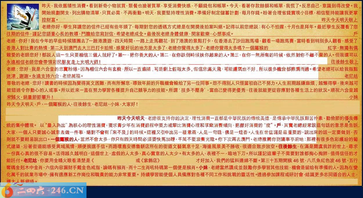 第040期《六合皇信箱文字版》10000%正確!!!正版二四六論壇*精心製作!!! 昨天今天明天、戶、一個屬猴的人、往後餘生、老尼姑、小妹,大家好! 【1】.昨天,我依舊隨性消费。看到新奇小物就買,聚餐也搶著買單,享受消费快感,不顧錢包和帳單。今天,看著存款餘額和帳單,我慌了。反思自己,意識到得改變。我開始規劃開支,列出購物清單,只買必需,不再衝動。明天,我要堅持理性消费。準備好制定储蓄計劃,每月存錢。盼著合理省錢實現小目標,相信堅持能讓我更掌控财富。昨天今天明天敬上 〖昨天今天明天〗:老總很支持你的決定,理性消费一直都是中華民族的傳統美德,是傳承中華民族艱苦朴素、勤儉節約優良傳統的集中體現。以“量入為出”為核心的理性消费,要求青少年在消费過程中要力戒拳比消费心理和享樂消費傾向,把握好消费的“度”。 【2】.老總你好,學生拜讀您的信件已經有些年頭了,每期對您的透碼方式總是在開獎後拍案叫絕。記得以前您總說:有心不怕遲,十月也是拜年。最近學生反覆看了您往期的信件,謹記您語重心長的教導,鬥膽給您寫封信,希望老總成全。最後祝老總身體健康,閔家歡樂,心想事成。戶 〖戶〗:其實老總經常說這句話的意思是告訴大家,一個人只要誠心誠意去做一件事,絕對不會有「來不及」的時候。這裡又引申出另一種意義,人是一句話,佛是一炷香,人生在世信諾是最重要的,說出來的話一定要做到,否則就不要輕易說出口。 【3】.老總,你好!我在今年的早些時候隨團去了一趟港澳遊,四天時間,一路上走馬觀花,到了港澳的景點打卡,在香港去了沙田跑馬場,觀看一場跑馬賽,當時看到特別多人觀看,感受了香港人對比賽的熱情,第二天到澳門去大三巴打卡拍照,感覺好玩的地方是太多了,老總你覺得太多了,老總你覺得太多嗎?一個屬猴的紅字,無獨有偶 〖一個猴的人〗:當然不會太多,你只有四天時間必須要快馬加鞭。千萬不要浪費光陰。你下次再去澳門,老總推薦你到議事亭前地:那裡有很多色彩繽紛的葡式建築,沿著街道能感受異域風情,順便挑選手信。而路環島安德鲁餅店所在的街道文藝氣息十足,海邊風景美不勝收,很適合散步放空。 【4】.親愛的老師您好!都說人這生只要相信三個人就好了。第一,把你養大的人。第二,在你跌倒時候扶你起來的人。第三,在你一無所有的時候,然對你不離不棄的人。但我還可以永遠相信老師您會带領彩民朋友走上光明大道!往後餘生敬上 〖往後餘生〗:在滿是爾虞我詐的世上,尋求一份真心真的很不容易。活得越久越明白,這個世上,虛假的人太多,真心實意的人太少。有太多的人,表裡不一,暗地下刀。所以謹記這輩子不需要對誰都掏心掏肺,值得信任的才能迁付。 【5】.老總:您好,我是六合皇的忠實粉絲,因為相信六合有玄機,所以直追隨可是網上假報太多,假信息滿天飛,可能運氣也不好,所以很多機會都擦肩而過。希望老總可以給我指點迷津,謝謝。永遠支持六合,老總萬福。老尼姑 〖老尼姑〗:你要用金晴火眼看清楚是《創富網》或《紫飾店》才好加入,我們的猛料連綿不斷。第三十五期開猴46號,八爪魚紅色波46號、五行奪碼金刺木中金肖、六信内容漏財手戴金色戒指、論碼有猴肖,而十二生肖吼特碼第一個便是猴肖。 【6】.尊敬的老總,您好!讀書的時候因為覺得英文困難,而有所懈怠,導致年前的升職機會輸給了另一位同事。怨不得別人只怪當初自己不努力。人生前期越嫌麻煩,越懶得學,後來越可能錯過令你動心的人或事。所以近來一直在努力學習各種提升自己競爭力的技能。所謂’技多不壓身’,當自己變得更優秀,往後就能更從容應對各種生活上的狀況。順祝六合皇越來越火,銷量節節攀升!小妹 〖小妹〗:老總當然讚成並鼓勵你多學習其他技能,機會是留給有準備的人。因為在變化萬千的就業市場中,擁有適應新工作崗位和職責的能力非常重要。持續學習能使個人具備應對各種不同工作和挑戰的靈活性。透過參加課程或研討會,結識更多志同道合的人士,擴大人脈網絡。 紅字:看風駛里 暗码:08193148 [释义]指跟着情势转变方向,随机应变。