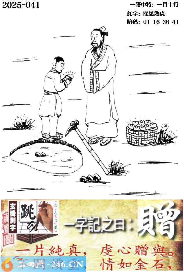 041期跑狗一字記之曰:【贈】 一片純真,虔心贈與。 不圖價重,情如金石。